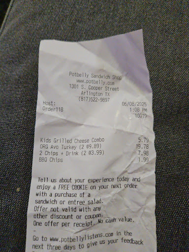 Ā Ā Ā Read moreEdit to update my review: Since posting the original review, a representative from Potbelly got in contact with me and let me know they would reach out to the upper management to see if they could improve things at this location. (They also immediately gave me two free sandwiches in my app immediately for letting them know, which was very kind). As soon as they informed management, I swear everything has been great at this location! I've not had a single order wrong since. Whatever y'all did, it worked! Thank you so much! :) Unfortunately, they get my order wrong at this location 90% of the time. I'm not exaggerating, I've done the math. I ask for a pick your pair with a turkey on multigrain and lettuce, ranch, and hot peppers. Side soup and a drink. Nothing more, nothing less. They always leave something off of my sandwich or make it with the wrong bread. I speak clearly and repeat myself, but it happens with different employees. Also most of them are nice, but there's at least one who always pressures me to tip when I...