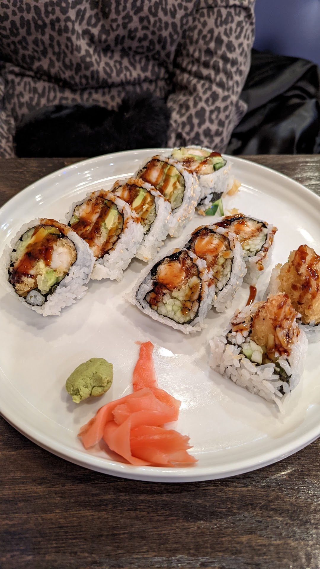Eel and Avocado roll, with a sweet sauce and cucumber. Very nice.