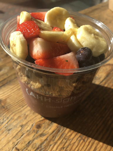 California: organic acai, bananas, blueberries, and almond milk topped with handmade granola, blueberries, bananas, and hemp hearts CaveMan: organic acai, caveman milk (house-made cashew milk) and bananas topped with handmade granola, dates, bananas, and shredded coconut