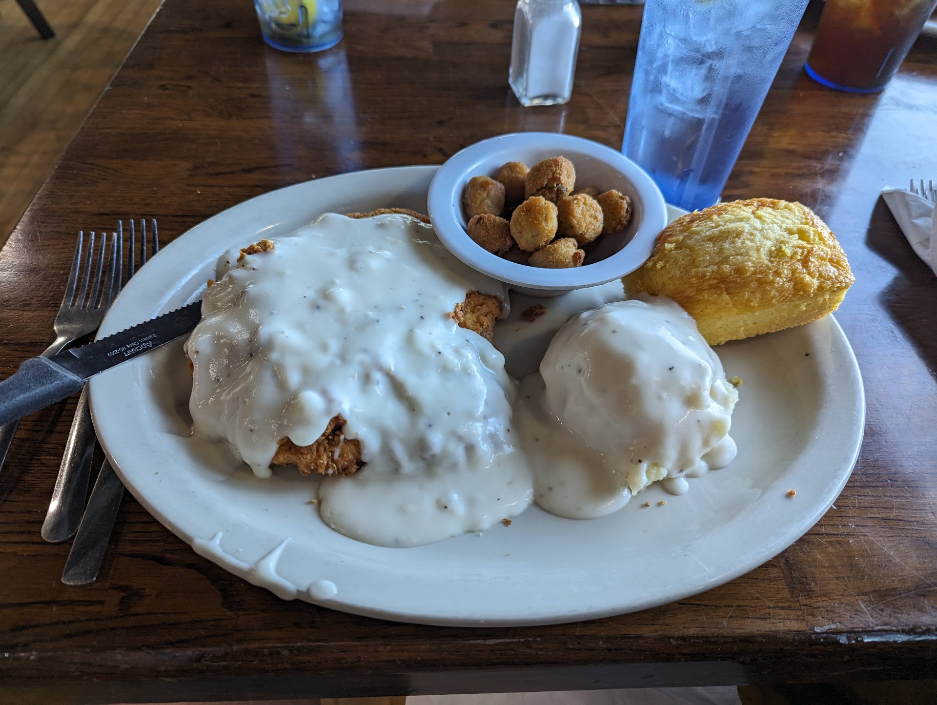 Read moreRead moreBack again. This time for breakfast. Pancake and eggs typical. Nothing special but the fried porkchop was delicious. Batter well seasoned. Best I've had in a long time. Previous review- First time here. IMPRESSIVE. Got a grilled chicken sandwich. It was quite tasty. Toasted honey wheat bun covering a juicy chicken filet. The lettuce tomato and pickles were delightfully fresh and the red onion of course gave it that kick i love on any sandwich. I give the sandwich an A. Side salad was very lacking though. A plate of lettuce, one tomato, cup of ranch. Ranch very lacking flavor as well but my intent was to keep it fairly healthy this day so bland and lacking is often expected with healthier options. My lunch mates rating. B on the chicken gumbo. B on the grilled porkchops. Good flavor but they were overcooked. The black eyes peas were just ok. Salmon was an A but wine sauce very lacking in flavor. Overall tho we were all pleased and will return. Hope to try their breakfast. A on service as well. Got a building history lesson while there too. Ohyea...