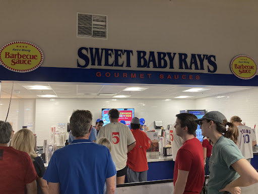 I spent a good chunk of time walking the outfield concourse, hoping to find something sweet or savory with a shorter line. Nothing really stood out, until I turned the corner and spotted the Sweet Baby Ray’s sign.