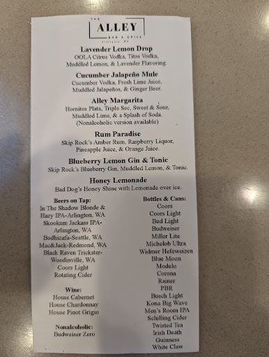 Located at 420 N Olympic Ave in Arlington, WA, The Alley Bar & Grill is a gritty, hard-hitting bowling alley that roars with raw power and bold flavors, built for tough guys who live for a challenge. This ain’t no soft spot—six battle-scarred wooden lanes dare you to step up, lit by 18 recessed can lights that blaze down like a spotlight on a heavyweight ring, casting a fierce glow over a space that’s all muscle and grit. The vibe is pure, unfiltered testosterone: the crack of pins, the growl of laughter, and the clink of cold beers make this place a fortress of brotherhood. The food here is a gut-punch of satisfaction, crafted for warriors who don’t mess with frills. Their burgers, hand-formed and grilled to perfection, are a meaty beast—sink your teeth into a bacon cheeseburger that’s dripping with primal juiciness, paired with fries that crunch like a knockout blow. The chicken strips are a rugged bite of tender, crispy glory, while the mozzarella sticks ooze with cheesy defiance, daring you to stop at just one. For the real tough guys, the wings come in hot, packing a fiery punch that’ll test your mettle and leave you sweating like you just bowled a perfect 300. Locals swear by the BLT, a no-nonsense classic that delivers every time with fresh, bold bites. The bar is the heart of this beast, those 18 can lights making every drink look like a trophy. Pound a Mai Tai—a local legend—or grip a craft beer as you watch the action through the windows between the dining area and lanes, passing brews to your crew like ammo in a firefight. The staff, like the tough-as-nails Katie, are the kind of crew you want in your corner, serving up cold ones and hard-earned respect with every pour. With bumpers and ramps for the young bloods and a patio for when you need to step out and breathe, The Alley Bar & Grill is a fortress where tough guys come to dominate the lanes and the table. Call 360-435-8600 to claim your spot, and step into this Arlington stronghold ready to strike hard...