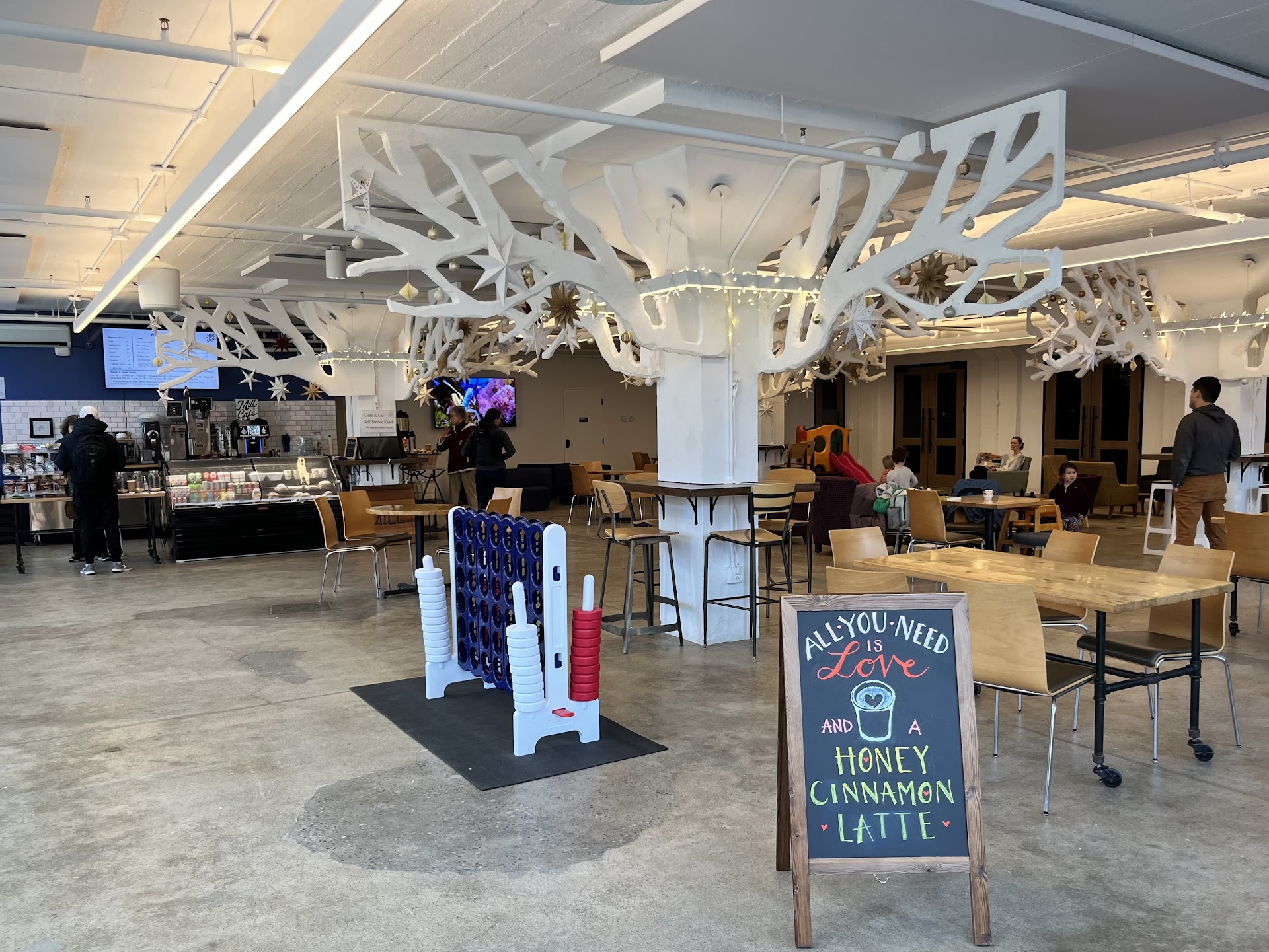 The Mill Cafe clearly has a vision and goal of fostering community. It the most reasonable prices anywhere around. Itâs the most kid/family-friendly coffee shop in the entire Boston metro area (20% of the cafe space is for/centered on the indoor play structure and toys, and mega-size chess pieces for the young at heart too). Thereâs a regular and wide variety of community gatherings they host or are hosted there (digital nomad co-work time! Writers! Knitters! Board game meet up! Toddler story time! Friday band and Biergarten!?). Thereâs even a âpay it forwardâ cork board where folks pre-buy coffee for others (the categories are amusing and heartwarming - things like teachers, anyone having a bad day, a new parent, a student whoâs starting at a new school).