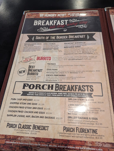 If your a breakfast fan like I am , the secret is Mom & Pop breakfast establishments. In the past 20 years Iāve tried many across the metroplex & my 2 fav as of recent where ā Our Place Restaurant in Mansfield ā & āJackie's Ham & Eggs in Lewisvilleā As of today āThe Porchā is my absolute #1 fav. ššš From the minute I walked in the door , to getting a table , ordering & receiving my breakfast ⦠āunder 10 minutesā (Yes they where busy) Their food is unbelievably delicious , the thick bacon, eggs cooked to perfection , their pancakes melt in your mouth . mmmmm