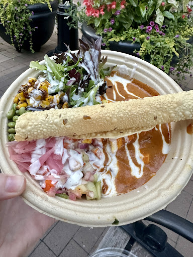 Read moreLove it! Tasty street food, naan pizza, & bowls. Easy order ahead by phone. Obsessed w/their Chole (spiced chickpeas), Momo (steamed dumplings), & Aloo Tikka (potato fritters)! Mango lassi is refreshing. Not always descriptions on the menu, so it's worth stopping in to ask what's what. I didn't know what a lot was, but now a big fan. The fast-casual bowls are good for a Chipotle type alternative. Very fresh! Fair prices - decent servings, $10 for lunch, bit more with desserts & sides. Mostly takeout since barely any room to sit, tho there's the whole plaza...