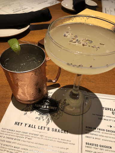 Only wish I could give them 10 stars! First visit for my both my bestie and me celebrating my birthday but it will be first of MANY. We splurged and ordered nearly double what we could eat because there were so many appealing menu items. But let's talk about the service first. From entry to the to leaving, we were made to feel valued and welcomed, like we were visiting the home of a family friend kind of vibe. We were greeted by the nicest man and seated immediately. Our server was quick to check in with us and give us menus and was all smiles. We started with Fried Green Tomatoes and Skillet Pimento and Cheese. Perfectly prepared. The breading on the tomatoes was crisp while the tomato itself was just crisp enough to maintain it's structure but so velvety that it was a good combination of textures. Underneath the tomatoes was a serving of the creamiest and most flavorable grits I have ever tasted - YUM. Loved the Pimento Cheese warmed up with chips. Its rare to have it warm but I think it might be my new favorite way to consume it. I also ordered a cocktail since it was a celebration. The Peach Sangria - and wow perfection again. The items were brought to us fairly quickly by what we thought was just a food runner. We asked him what his favorite dish is and why. He stopped and gave us a run down sealing the deal of what I was going to order when he told us he was the executive chef and he had just wanted to get out of the kitchen for a minute and decided to bring us the dishes himself. The team of employees genuinely seem to enjoy working there and it spills out to how they serve their customers. I ordered the chef's favorite, Nashville hot chicken on macaroni & Cheese waffle with homemade pickles on top. My bestie ordered the Shrimp Po Boy with collard greens as a side. I'm not a big greens kind of girl, but I would order them again bc they were that good. I took home nearly all of my entrée as I was stuffed from the appetizers and wanted to sample their desserts, a decision I don't regret. Who can resist Banana Pudding and Pecan Pie?! I felt like I was back at my Grandma's house in Tennessee. True Southern food in a restaurant is hard to pull off but WOW Tupelo Honey not only doesn't but have set the standard of what all other eateries should strive for. Definitely putting this gem into our dining out rotation. Side note - we felt treated like Queens and who doesn't love a little fuss over themselves once in a while. The gentlemen working this restaurant really are...