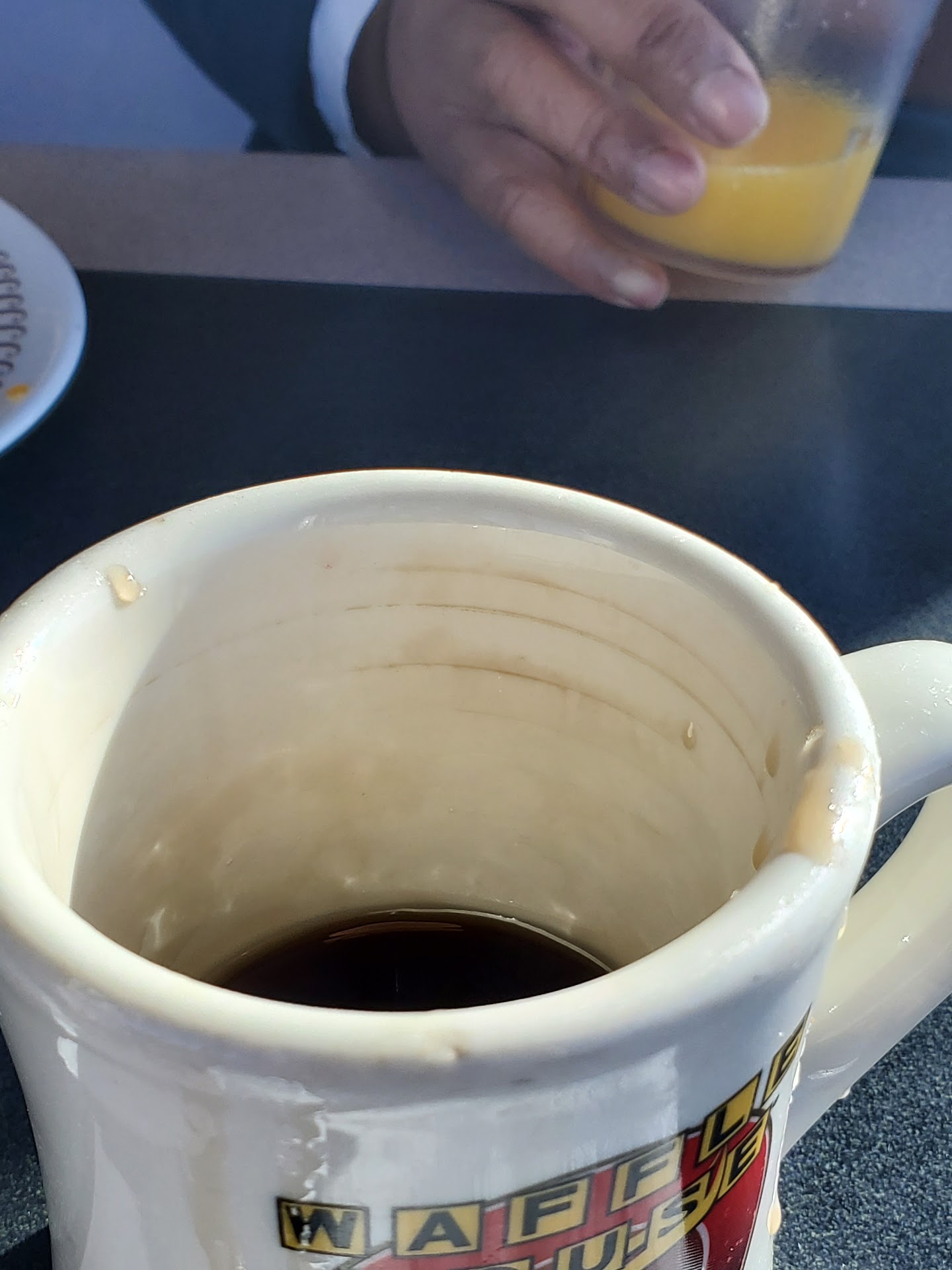 The kicker and what made me write you today was when we got ready to leave. Our meal totaled $27.17. Despite the poor service and unclean issues, I rounded the payment up to $30. I waited for the waitress to say thank you for coming, have a nice day, instead the waitress asked what was we waiting for. I said for you to at least say thank you or have a nice day....NOPE! She rolled her eyes and walked away. Seriously? No more! I will never go to another WH. Again. Done. This visit was on Saturday November 23rd at 1530. And no the place was not busy still not a excuse to be that unprofessional. Location was Cooper & Arkansas in Arlington TX Oh yes coffee cup had multiple coffee rings in. We ask I different waitresses could she warm up some syrup. She did so in a coffee cup. Picture below This is just terrible. I order my food to be put in a carry out format just because I did not want to eat from dirty utensils. I ordered the breakfast scrambler bowl (bacon) with onions & mushrooms. My sis order All star meal with raisin toast &bacon we both had waffles that was not done in middle waffle did not rise it was very mushy in middle. Very flat like. But what the hell I was ready to just go. I did tell the young lady at register about the Waffle gave me no response. There are no WH where my sis live in MD & this was her pick. So i thought what the hell let's give it a...