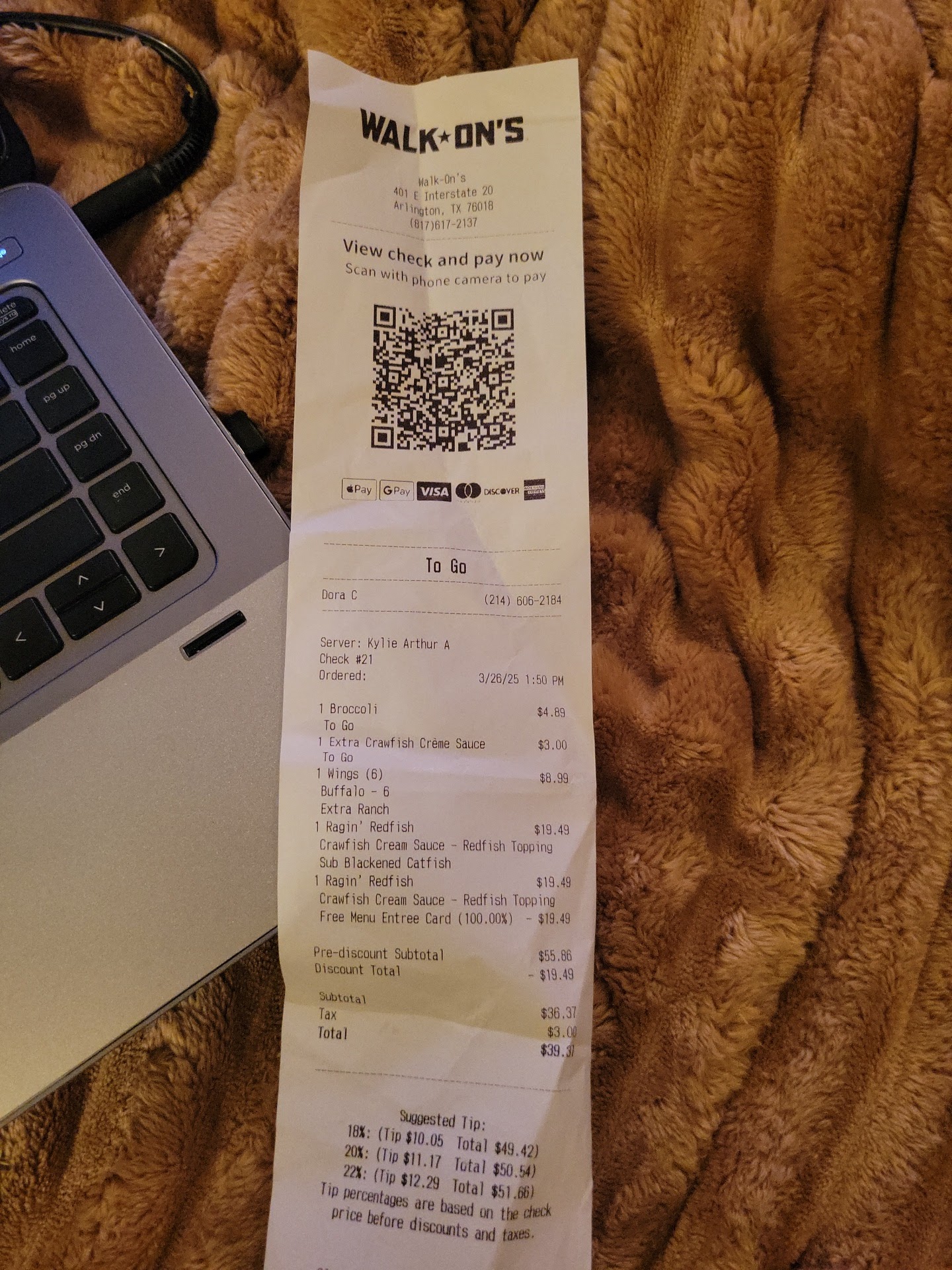 LONG REVIEW ALERTOn Wed, March 26th, 2025, as I was driving from North DALLAS to the Walk On's Arlington location, I called them at 1:30pm and asked how long was it taking for PICKUP ORDERS. The guy said 15 mins. So I told him I would get my order together and call him right back.