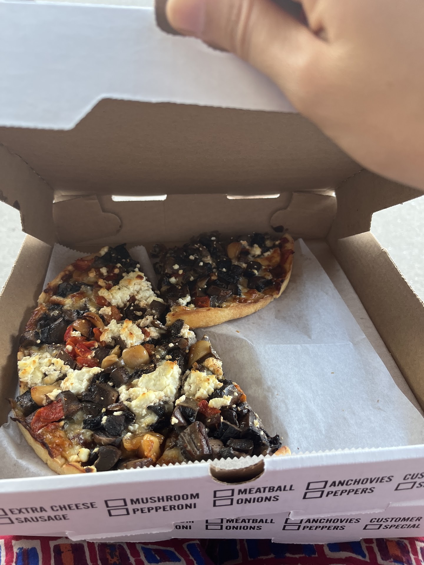 I needed bread or pasta for my 4 year old who is a picky eater. We lived next door so we knew the area. So I stood up and went and bought some pretzels for my child to eat, from the convenience store next door. Upon re-entering the restaurant, the same server who is apparently the manager stopped me in my tracks to say: “Mam, we don’t allow outside products in the restaurant “, I explained it’s for my 4 year old who needs to eat something and that they don’t serve anything he eats, no Children’s menu, nothing. The answer was a firm: “no outside products in the restaurant, we serve what we serve and that is that.” So we put our pizza’s, which were already on the table, in boxes, paid, and left.