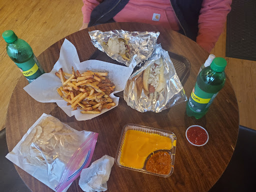 Let's start with the good shall we... The hot dogs are more than bun length. They hang out of the bun on both ends. The buns are fresh. The staff was pleasant and professional. The restaurant was clean. That being said, I ordered 3 hot dogs with mustard and onions. I was handed 3 hot dogs on foil, on a plate, and told that the fixins were behind me. Well, OK, I wasn't really planning on fixing my own food, that's why I went into an established business, but what ever. I dressed my dogs, wrapped my dogs, bagged my dogs, and got my own napkins. The only thing I didn't do for myself is make my own change. Which brings up my last point... $6.39... Let me type that again in case you missed it. $6.39 for 3 hot dogs that I basically made myself. Ummmm..... Don't get me wrong, they were good, but Jesus. For $6.39 they should have brought them to...