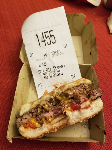 My husband ran to McDonald's to grab a late dinner for us. He arrived back home and joked about the staff probably not being thrilled with him since he "made them leave the 'water cooler' to cook" (there were ~5 employees that could be seen from the drive thru window just hanging out, chatting). Apparently there were some 6 cars in front of my husband when he arrived; they all got through the line and drive thru window quickly, except for my husband. We're guessing the folks in front of him all ordered things that were precooked and hanging out under a warmer just ready to go. Our order took a long while; however, as you can tell from the picture, not long enough! The image doesn't do the quantity of raw meat justice, but I think the visible pink will suffice. Don't get me wrong, I enjoy a medium rare burger... From a restaurant or my own kitchen though, not a fast food joint whose quality of meat is questionable. At facilities such as these ALL meat should...