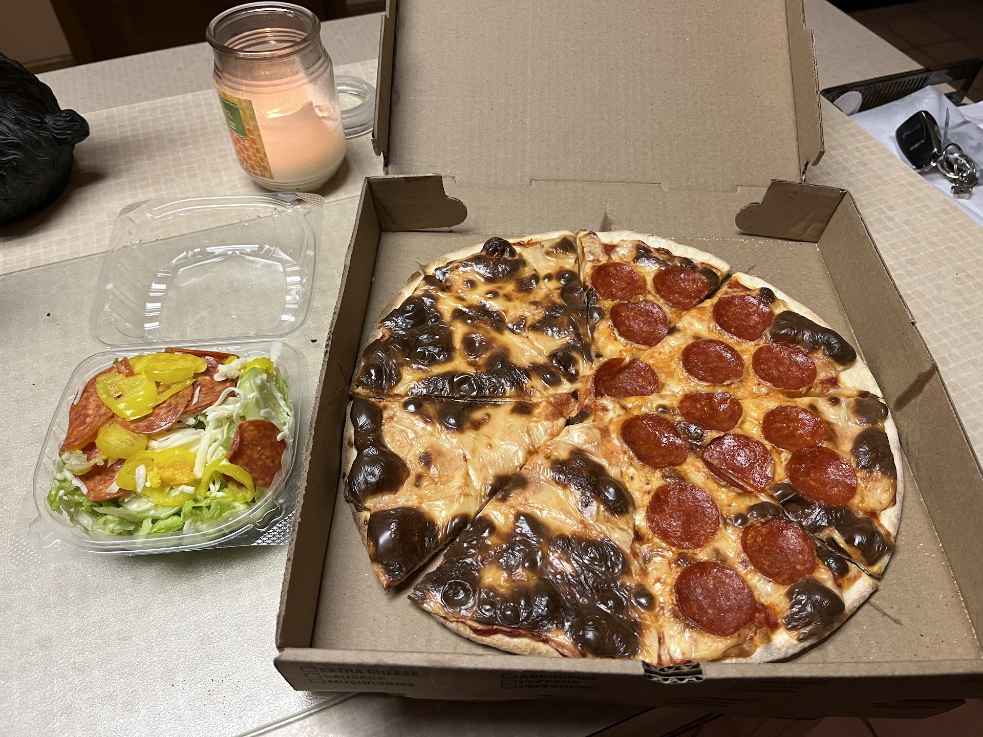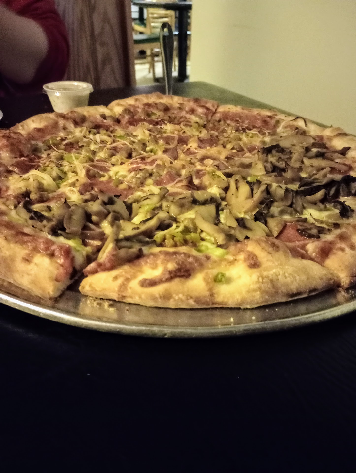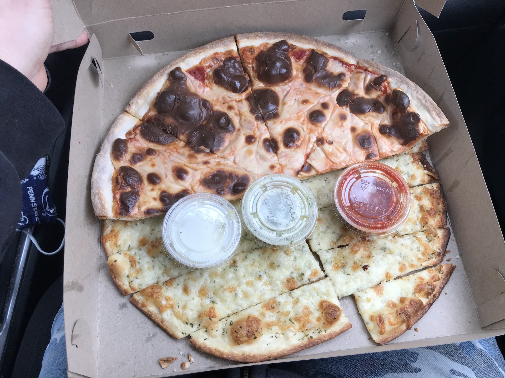 We ordered garlic bread sticks, a meatball hoagie, a large supreme pizza on the New York Style Crust, and we each had drinks. I had Cream Soda, and she had some sort of cherry pop that I can't remember.