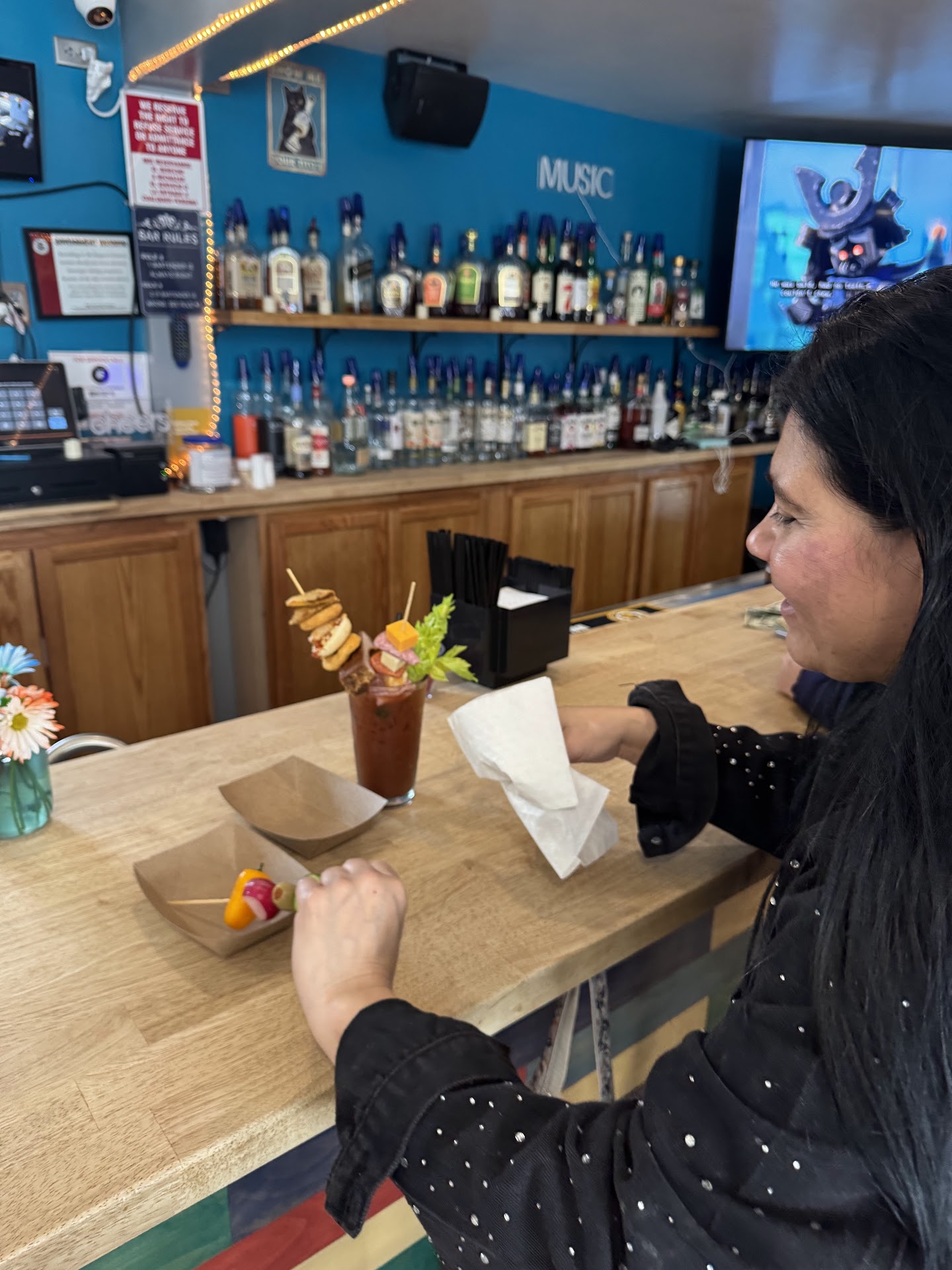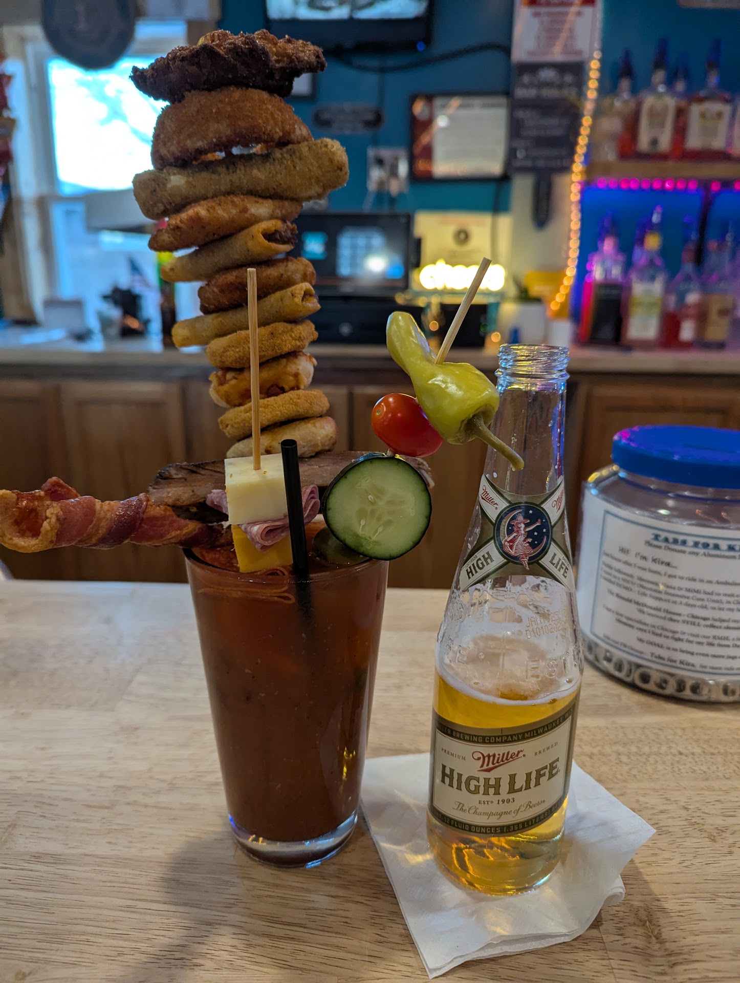 Oooooh boy!! When I tell you these are the best bloodys in the area, I mean it. The short rib alone is worth the trip. The mix itself is house made, you can choose to just have a regular with olives, cheese, meat, and a pickle or have the food which for us was an onion ring, ravioli, bagel bites, and mini tacos plus the previously mentioned items. Service is excellent! Manda took care of us and then Victoria came in and was extremely kind and hospitable as well. Highly recommend. Darts, fresh popcorn, gaming machines, and table bags are calling...