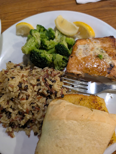 Read moreIt's Denny's so order accordingly. I needed to be healthy for a bit and ordered the "wow" caught salmon. I am certain it was microwaved as it was weirdly hot but not grilled. Only microwave could heat it inside out. For the $16 that it costs, it was marginal along with the same "streamed" but mushy bundle of broccoli. The soggy garlic bread aligned with the microwave theory. It was tasty soaked in butter. I might learn to appreciate it more in another 15-20 years when no chew foods would be preferred. The tap water tasted like tap water. My side salad needed some weeding of the dead but after a few pieces, it was ok. For a Denny's, this one is above average. Our waiter served well. The place wasn't too busy and just before Christmas where malls and big restaurants are hard to get to and parking is war, steering away for a different venue made it so much easier to gather...