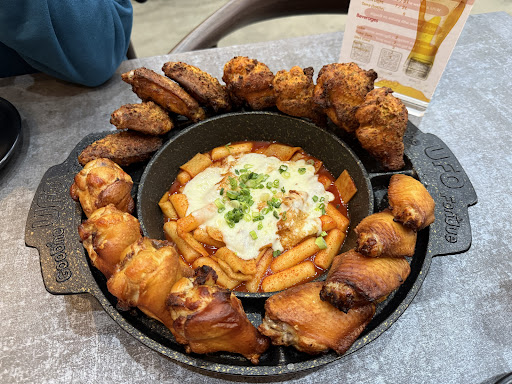 UFO CHICKEN: Comes with 16 Chicken Wings, pick 2 flavors and with zingy spicy Topokki in the center.