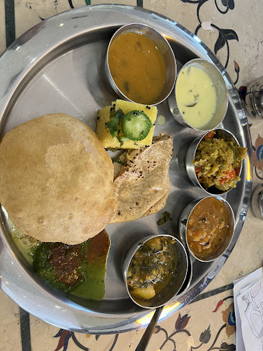 The food is primarily based on the styles of the western coast of India. The thali contains a starter, some appetizers, 3 vegetables, kadhi, daal, roti and/or puri, rice or khichadi with a dessert of your choice to end it all. You need to have some tolerance to spicy food though.