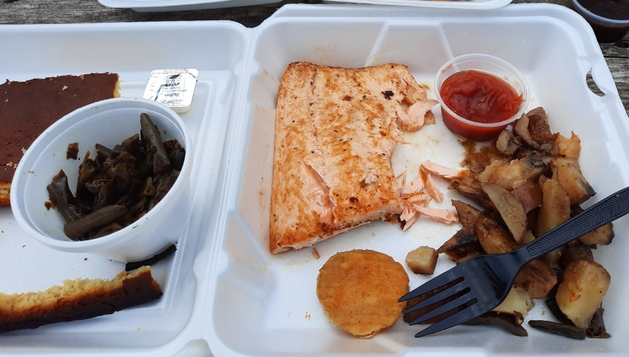 Read moreI'm not sure what happened, but I ate recently on 6/2/2022 in the evening and it was really a very mixed experience. I ordered the salmon and sides of hobo potatoes and green beans. The salmon was likely the best I've ever had anywhere. The green beans were black in color and severely burnt and bitter. The "cornbread" was actually badly burnt vanilla sheet cake. The hobo potatoes contained no onions, green peppers, or bacon as usual and advertised and were very old and slimy. See the attached pics of the burnt vanilla sheet cake passed as "cornbread" and the black green beans.