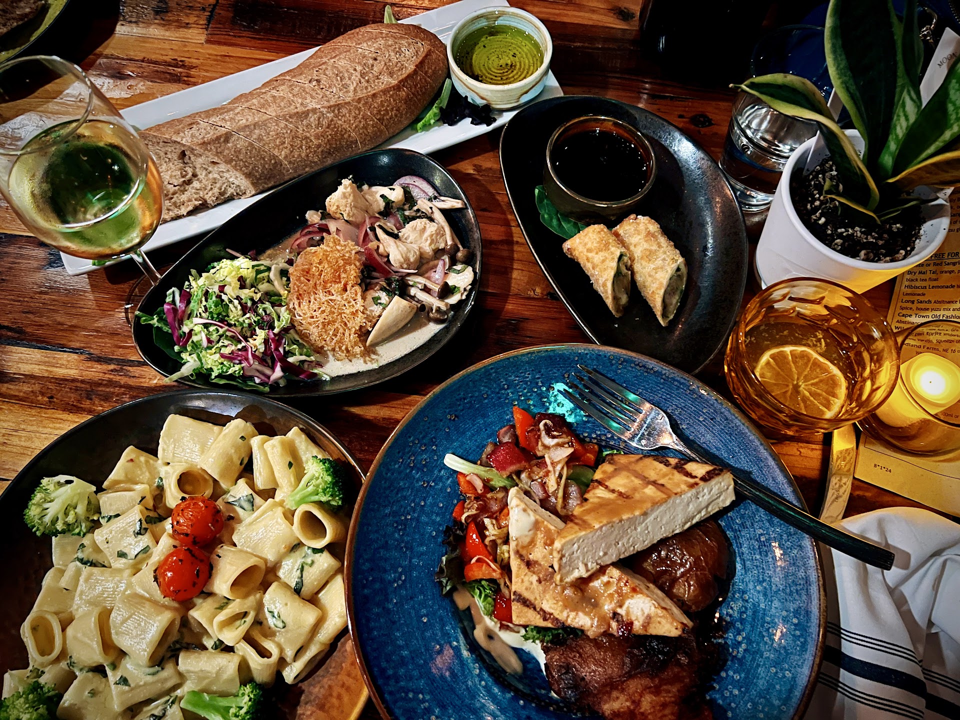 We started with the Egg Rolls and Sourdough Bread with Oil. The Lychee Martini was made from a puree and on the sweet side but delicious as ever. Very refreshing! The bread is worth taking home in a paper bag if you don’t finish it. We had some the next day with breakfast eggs and butter. The Tofu Steak and Cauliflower reheats very well the next day and the Mac n Cheese (made vegan by cashew cream) is great but I would have liked more seasoning and more sauce. The noodles were cooked to perfection. My great friend enjoyed the quesadilla. It was crisp and flavorful and not too big but enough for one person.
