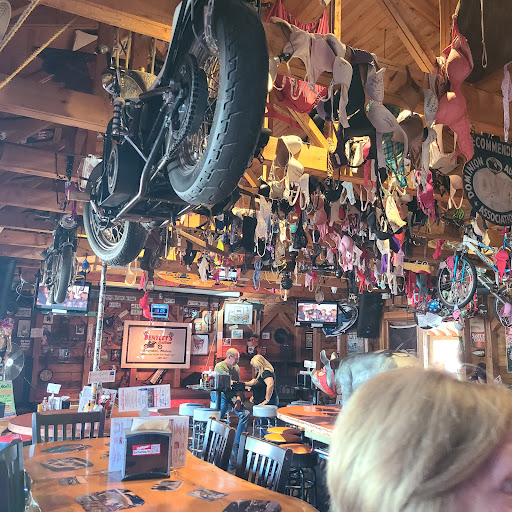 Bentley's is perfect for your geriatric biker crowd, I felt bad for the 39 year old bachelor who was by far the youngest person there except for the twenty-something upscale escort dancing with a sixty-something billionaire software dude who was wearing what resembled MC Hammer pants and a silk shirt that probably cost more than my motorcycle. But Bentley's is also perfect for cosplay, say you just finished binge watching Sons Of Anarchy for the eleventh time and you're wondering where can I trailer my bike this weekend? Look no further, load that forty-thousand dollar CVO on the trailer behind your hundred thousand dollar mobil-mansion and head on down. Don't worry about a thing cause we wand everyone thorough the doors, no weapons, such as a leatherman or fingernail tweezers allowed! So when that puffy-chested douchebag bumps into you at least you know he is not armed. Once in the main bar area you see a panhead and a couple other nice old bikes chained to the ceiling, I felt like a kid at the zoo who wanted to set the animals free, but I fought the urge because I was afraid I would get tangled up in the hundreds of old dusty bras hanging from the ceiling.(which I highly doubt were put there by women who were so inspired by the sexy ambiance they thought to themselves "I'm setting the girls loose") nah, looks more like someone raided Good Will. Oh and the T-shirt and beer cozy giveaway was incredible, I never saw such exaggerated enthusiasm, people screamed like the were handing out Harleys....I shook my head in bewilderment. Worried about your beauty-sleep? No problem they have a strict no fun / no noise environment from 11pm to 8am, that means lights out biker! And yes that includes camp fires! In the troublesome event some real bikers show up we will send in our golf cart patrols and shine flashlights in their faces till they leave or go to bed. If this sounds good to you get your AARP and...