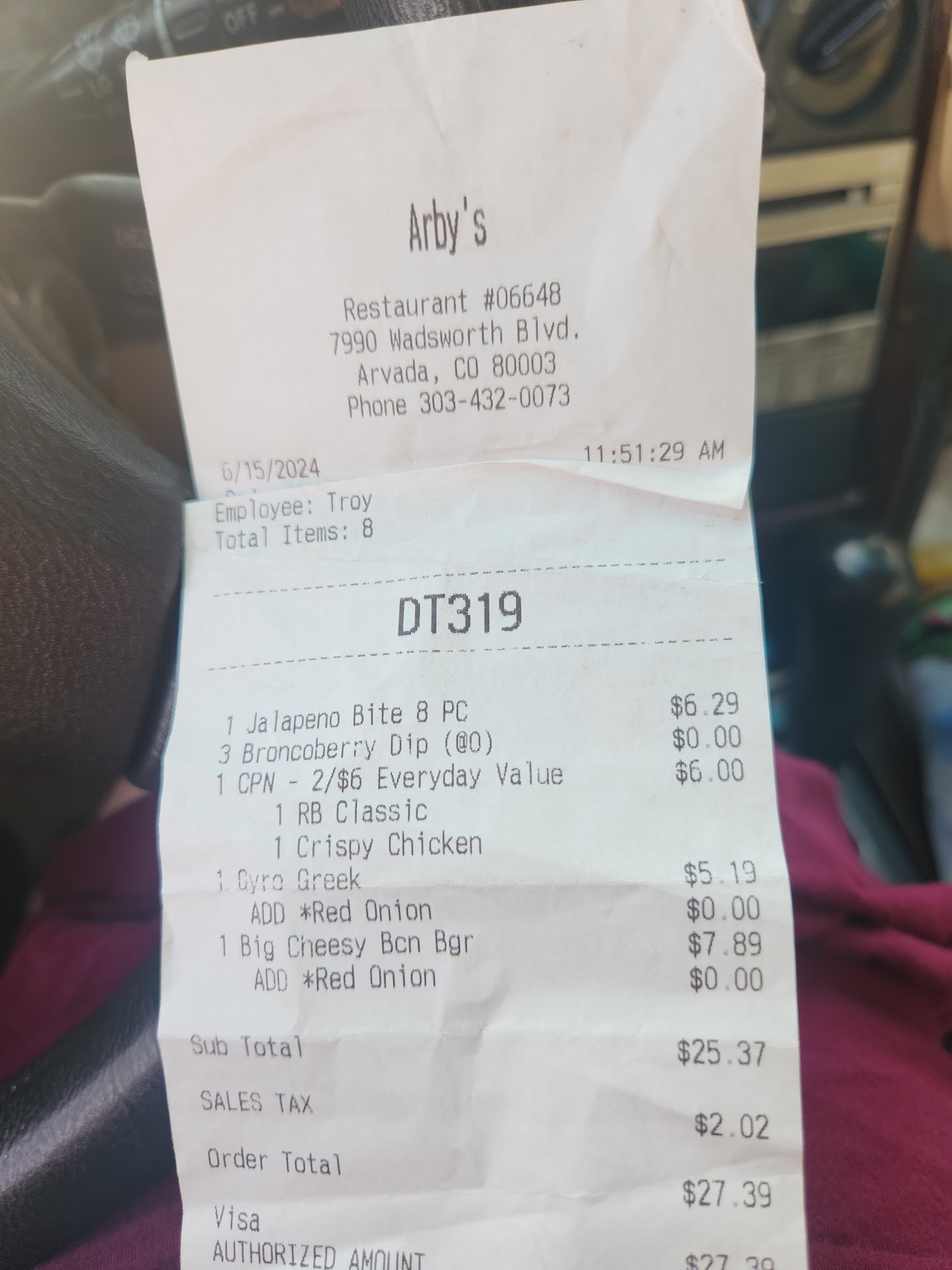 Read moreI visited this restaurant on Friday night and drove an extra 4 miles to this location because of the better reviews and hoping we would receive quality customer service but instead we wasted our time, money, and gas to end the night with inedible food. I called the store right as we got home (15 minutes later) saying they forgot the Roast Beef sandwich and told the manager I would like a refund. We then noticed they forgot our 2 Buffalo Chicken sliders as well as the other sandwich. We ended up having to drive somewhere else so my boyfriend could have dinner. As I started to eat the Turkey Club and medium fries I noticed that the entire contents of the turkey sandwich were slapped into the box and only barely on the bread. The turkey was so dry and there was so much mayo that it made the bread soggy. It was repulsive. The two orders of fries were tiny bits and ends of fries and were burnt and also inedible. I returned to the store today to express my disappointment and collect my wasted money back and the manager refused to give me a full refund and only returned the money for the missing sandwiches. We wasted 35 minutes of our night and 10 miles of driving just to lose $24.79 on horrendous food and being treated poorly. He tried offering to remake the food or give me a shake or fries, but we already knew the standard of their food preparation and quality. He tried to imply that I was lying about our experience just like “everyone else that comes back for a refund” but it’s clear as to why this keeps happening - THEY CANNOT PRODUCE ANY GOOD FOOD OR GET ANYONES ORDER CORRECT. My receipt number is D2214 and I hope Arby’s corporate takes a look at their Lakewood to Westminster stores and either shuts them down or fixes their management, staff, and food quality because that’s just pathetic. Don’t waste your efforts on this place -...