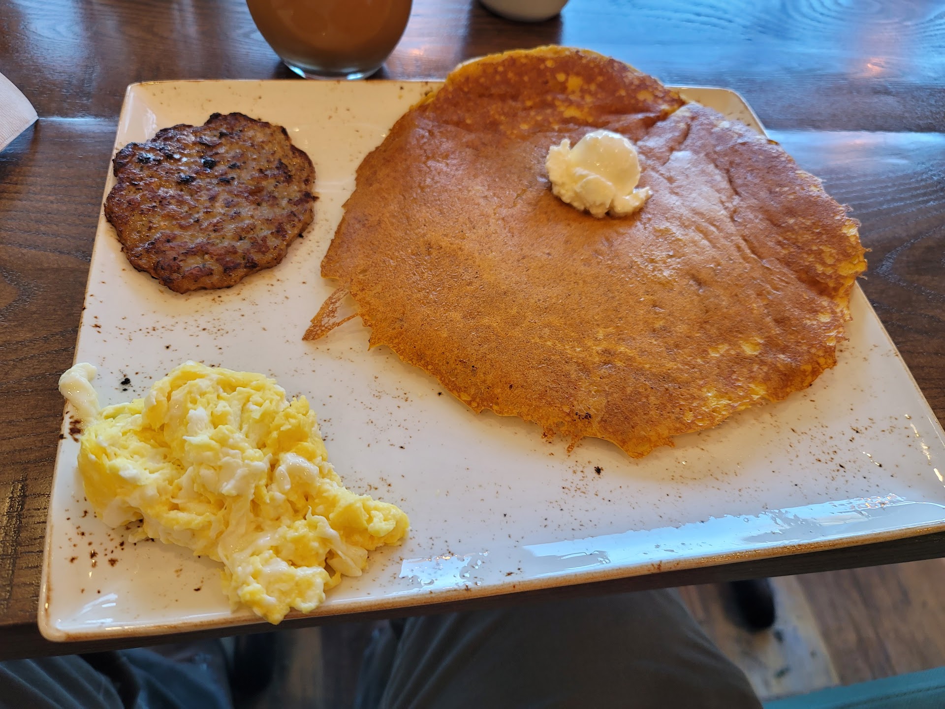 The food was delightful and delectable in equal measure. The pumpkin pancake was large, decently thick, and fluffy. The pumpkin flavor was very reminiscent of pumpkin pie (shocker, I know š¤Æ), with just a hint of that seasonal pumpkin spice. Just imagine a warm, fluffy pumpkin pie flavored pancake, ahh, that's the stuff!