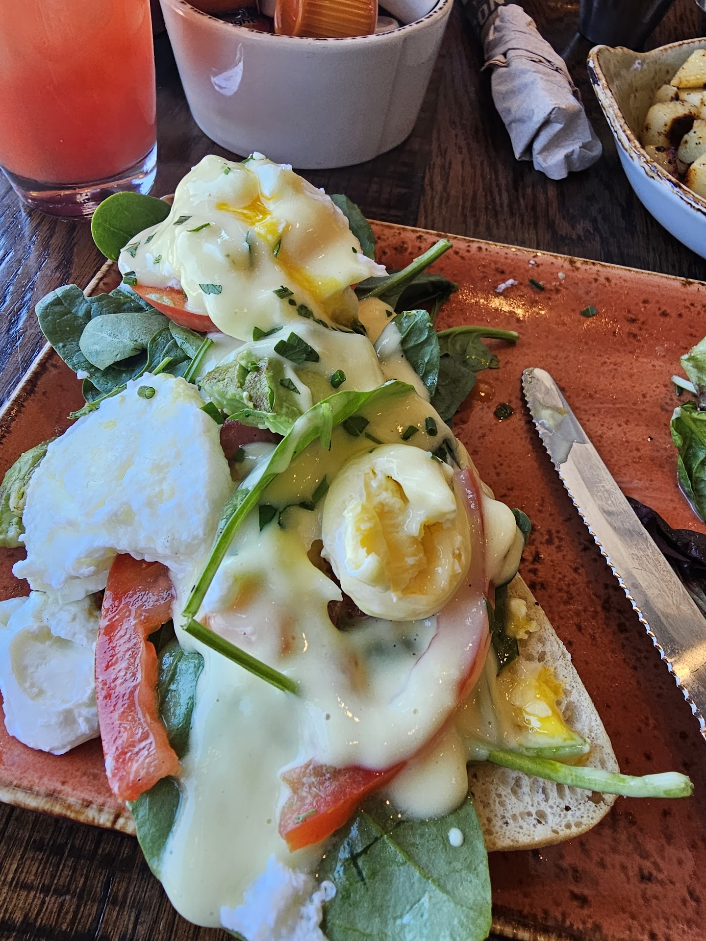 Quinoa/Sausage/Kale/Eggs(over easy)/Grilled Tomatoes and Mushrooms. No seasoning whatsoever on the quinoa, or the eggs, with a slight taste of the promised lemon vinaigrette and evoo(curse you Rachel Ray). The kale was there, tender and cooked. as were the eggs. The true stars, however, are the tomatoes and the mushrooms. Tomatoes were sweet and flavorful, not over done, but with a nice char. The mushrooms were earthy and flavorful, with a great firmness and mouth feel. The sausage was spongy and tasted as though bulk "crumbles" were bought frozen, and thawed to order. Whatever cheese was shredded over top seems a vestigial garnish. It added nothing I could detect. Perhaps incorporating with bechamel and drizzling over, with a sprinkle of nutmeg, would improve its self esteem.