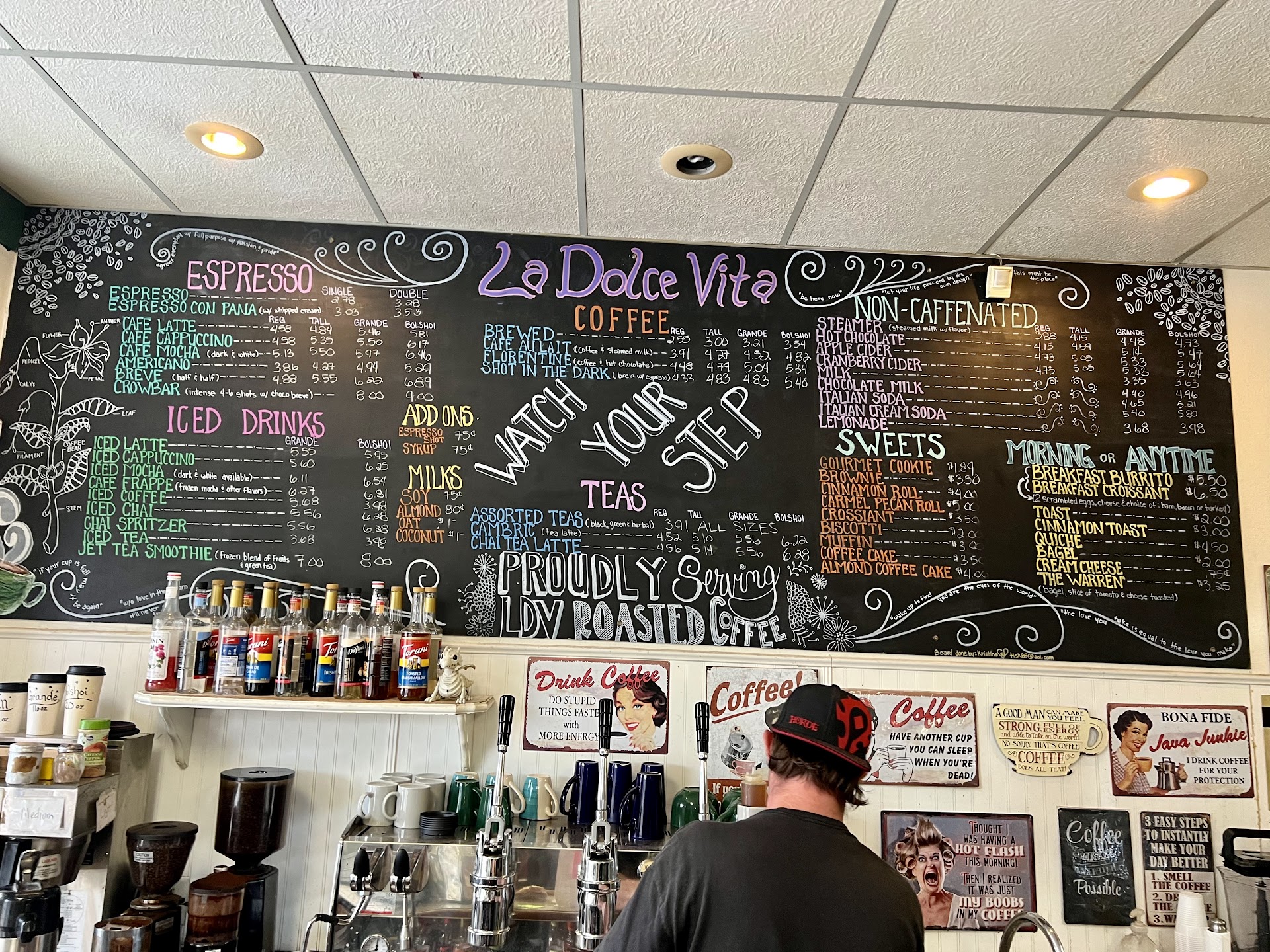 We personally didn’t have food or enjoy our coffees. It was too bitter for our tastes. We’ve been searching out locally owned coffee shops for vanilla lattes since last summer after enjoying them so much all over Europe. Or cafe lattes, depending on geography. lol We rarely find a place that has everything but most places have at least one thing that is really great and sometimes, like here at La Dolce Vita, you find a little gem that you just don’t expect. If you’re an 80’s kid or… wiser… haha… or you have spent time in the Midwest for example, walking through either door of this place will make your heart smile. It’s older and loved, what some might call shabby, with a feeling… There is a feeling and you GET a feeling. Anyway, we love this little place just next time we’ll maybe ask for extra milk and...
