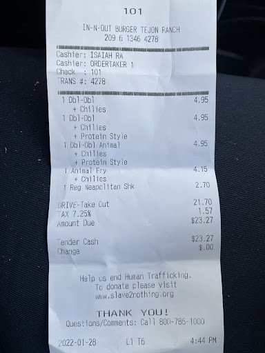Read moreI had my first In n Out in the 1950's when they had 1 place. Since then In n Out has been my favorite fast food joint. There have been literally hundreds of visits which were 5 star experiences.