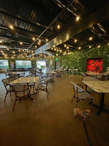 Open for lunch, dinner, and weekend brunch, the space is beautifully designed to bring the outdoors in, with green floral backdrops, hanging string lights, and framed flower displays that create a fresh, modern ambiance.