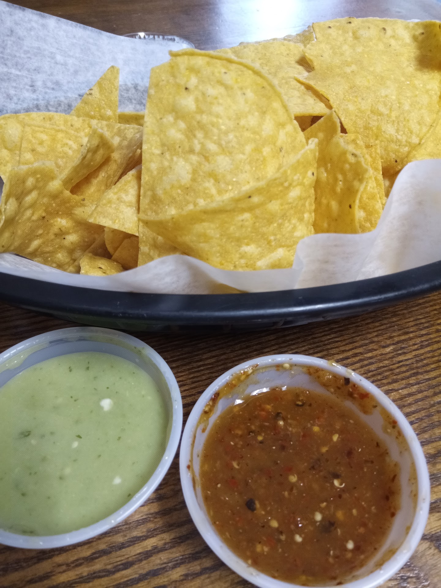 Chips.... fried hard and could handle any dip without breaking. Salsa....green avocado cilantro salsa that had some heat, but wasn't overpowering.