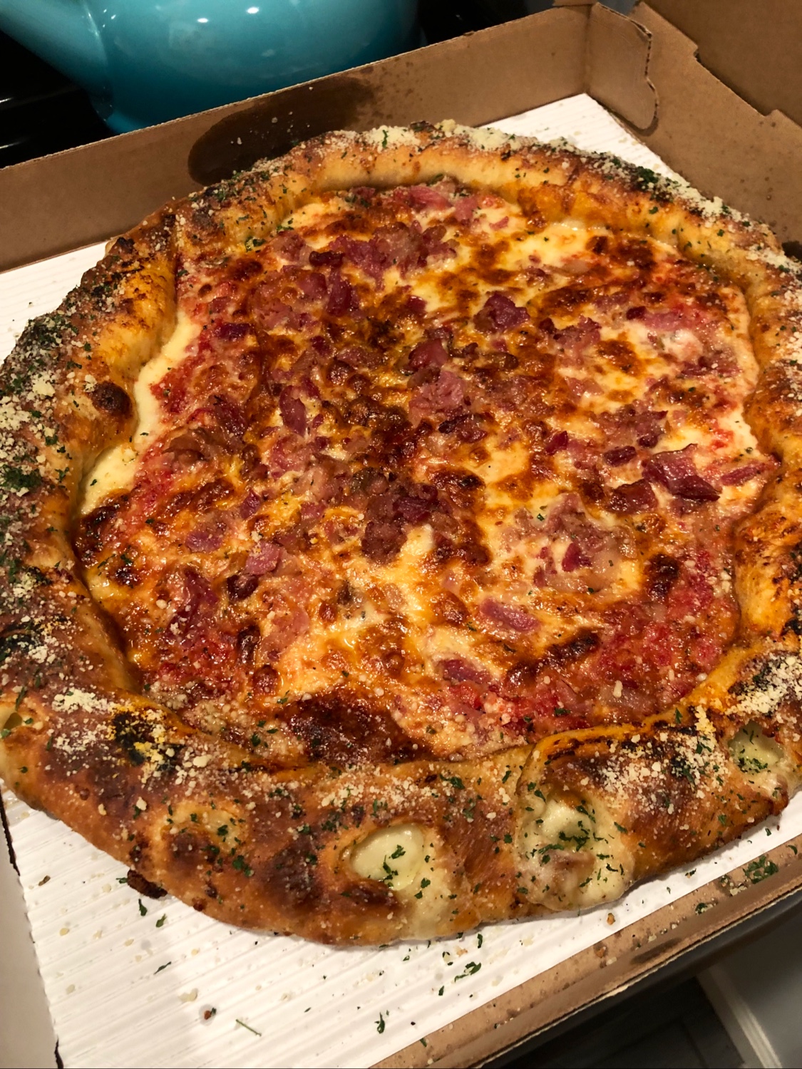 So the item I wanted was a meatball pizza that had meatball garlic knots as the crust. This would have been sufficient enough for anyone but ya know … not us 😆. We also ordered a pizza with cup and char pepperoni and chopped up mozz sticks on it where the crust was chicken vodka parm sliders. WHAT?!?! crazy. And maybe we added some wings. And uhh..maybe some thunder sticks.