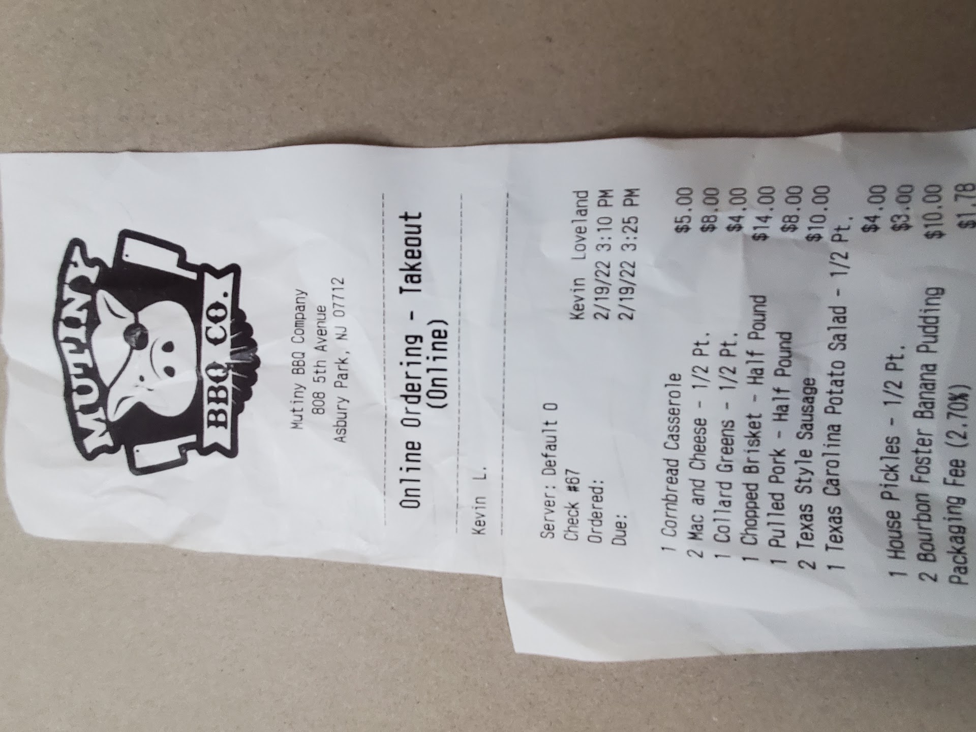 Read moreWhen looking for the best BBQ you need to look no further then Mutiny BBQ Company of Asbury Park! Tried to order a complete sample of the menu...unfortunately the ribs and turkey were out of stock...but to be fair the web site warns " we are a pit to plate, fresh food operation and may sell out of the most popular items". But the items I did order did not disappoint. The Brisket...I had chopped because I love the burnt ends...was incredible. Unlike the chopped brisket offered at another BBQ joint (local smoke house) where the meat texture is often mushy and smothered in some sweet so called BBQ sauce...Mutinys brisket stood firm and tender and surprise...you actually can taste the meat. The BBQ sauce that's served on the side is thick, smokey with a nice mixture of spices...it complements the meat taste not smothers it. The pulled pork was equally as good! Also enjoyed the Texas style sausage..AKA "hot gut". A crispy sausage link with a nice spicy kick. All served with the house pickles and pickled onions. A nice touch for sure. Also try the corn bread casserole..sort of a warm bread pudding...corn bread style. The best side hands down is the Mac and Cheese. A creamy mixture of sharp cheddar and gruyere added to perfectly cooked shells topped with Cheez-it crumbles...definitely the best I ever had at a BBQ joint!! The banana pudding had a great taste but was soupy..will try it again...only hope next time...it's pudding not soup. It always seems when you are looking for the best...it can be found in...