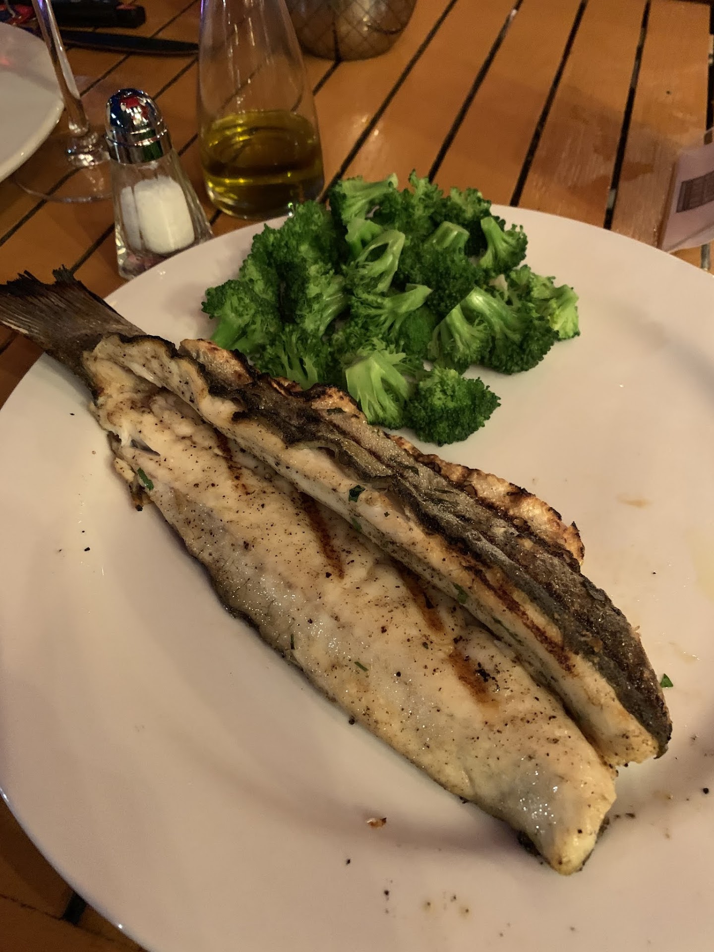 -Our usual calamari appetizer was sloppily prepared. The dish was under-fried white and mushy (not golden brown delicious) with a huge chunk of fried lemon about a half inch thick. My favorite part of that dish is usually the paper thin fried lemon slices! The fish, at least, was tender.