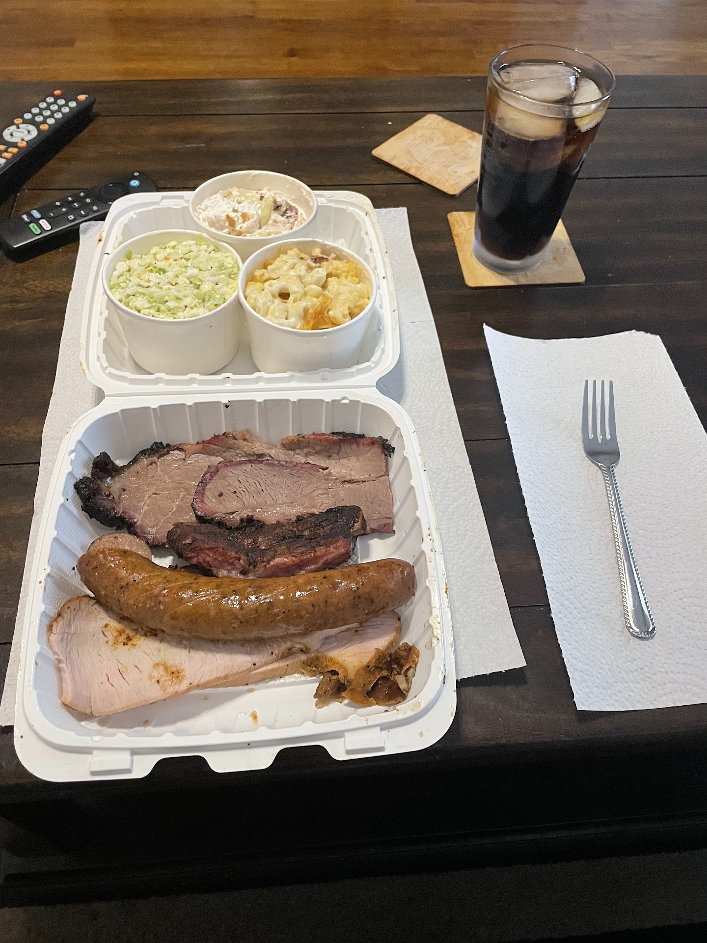 Now to what your hear for. The food. I basically made my own sampler platter. -1/4lb Texas brisket -1/4lb smoked turkey -1 jalapeño sausage -1 rib bone smoked Mac and cheese -cole slaw strawberry pudding