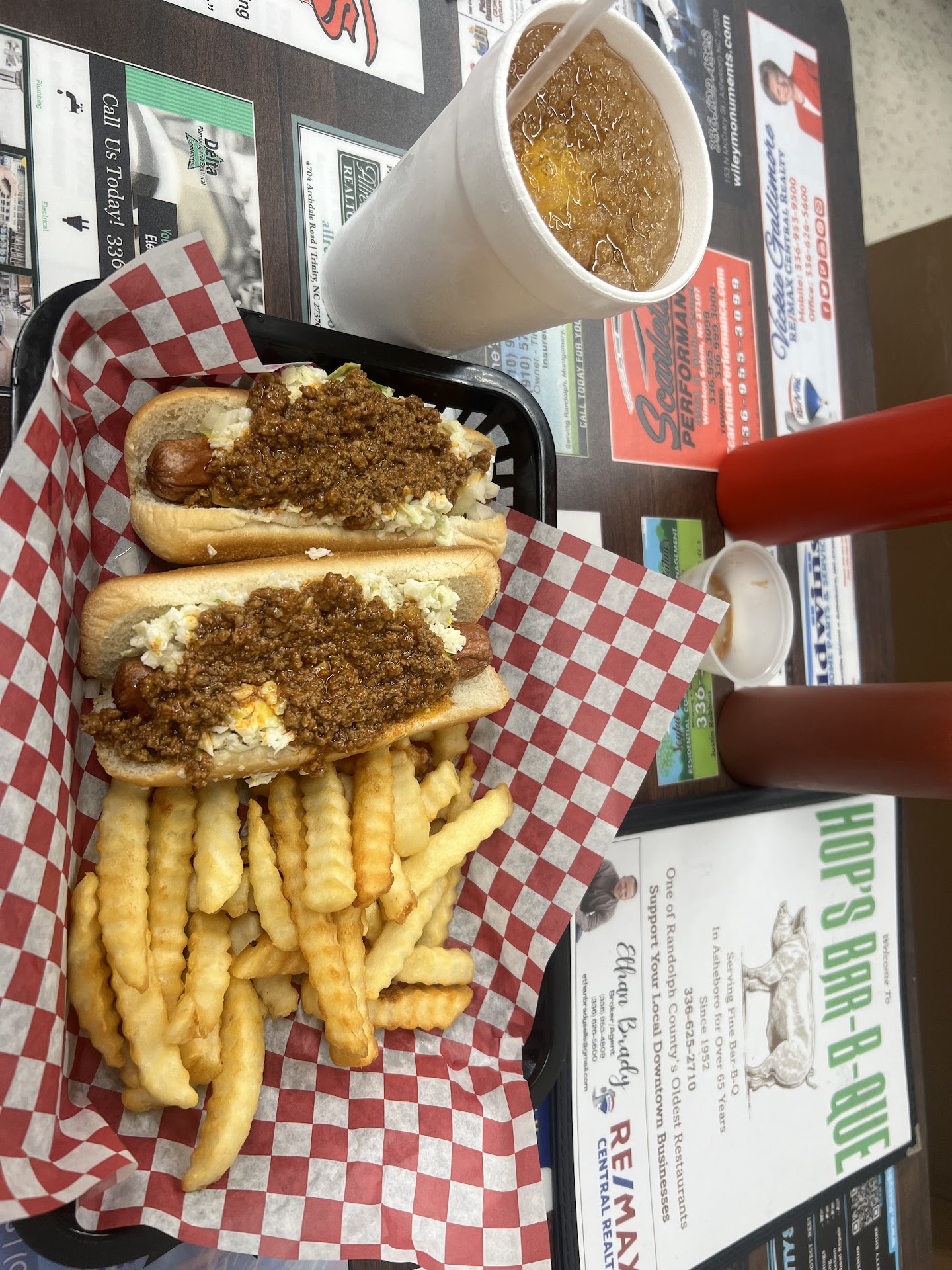 Walking around downtown Asheboro looking for a bite. Lot of the spots we googled were closed today when we stumbled upon Hops. The inside was open so we went for the board specials for Thursday. I had the Veg beef soup and sandwich (grilled cheese), wife had the chicken quesadilla with nachos and queso sauce. Her chicken was tender and had a nice grill on it. She skipped the grilled peppers (mistake) but was cheesy and the tortilla was grilled and tender. Chips were hot and cheese dip was warm and tasty. My grilled cheese was average, but that soup was some of the BEST I’ve ever had! Rich, meaty, full of grilled hamburger, stew beef and vegetables. I didn’t mention to the wife until I had a chance to google what I’d noticed, but swear I’d tasted a hint of sweet pickle juice in the stew as a sweetener. Found several Eastern European recipes on line mentioning beef stew and pickle brine. I may be wrong but will try to recreate their stew at home soon. If the chief wants to shoot me that recipe I promise not to share. Great place that’s been there for years according to the historical marker. Didn’t even try their namesake so I’ll have to...