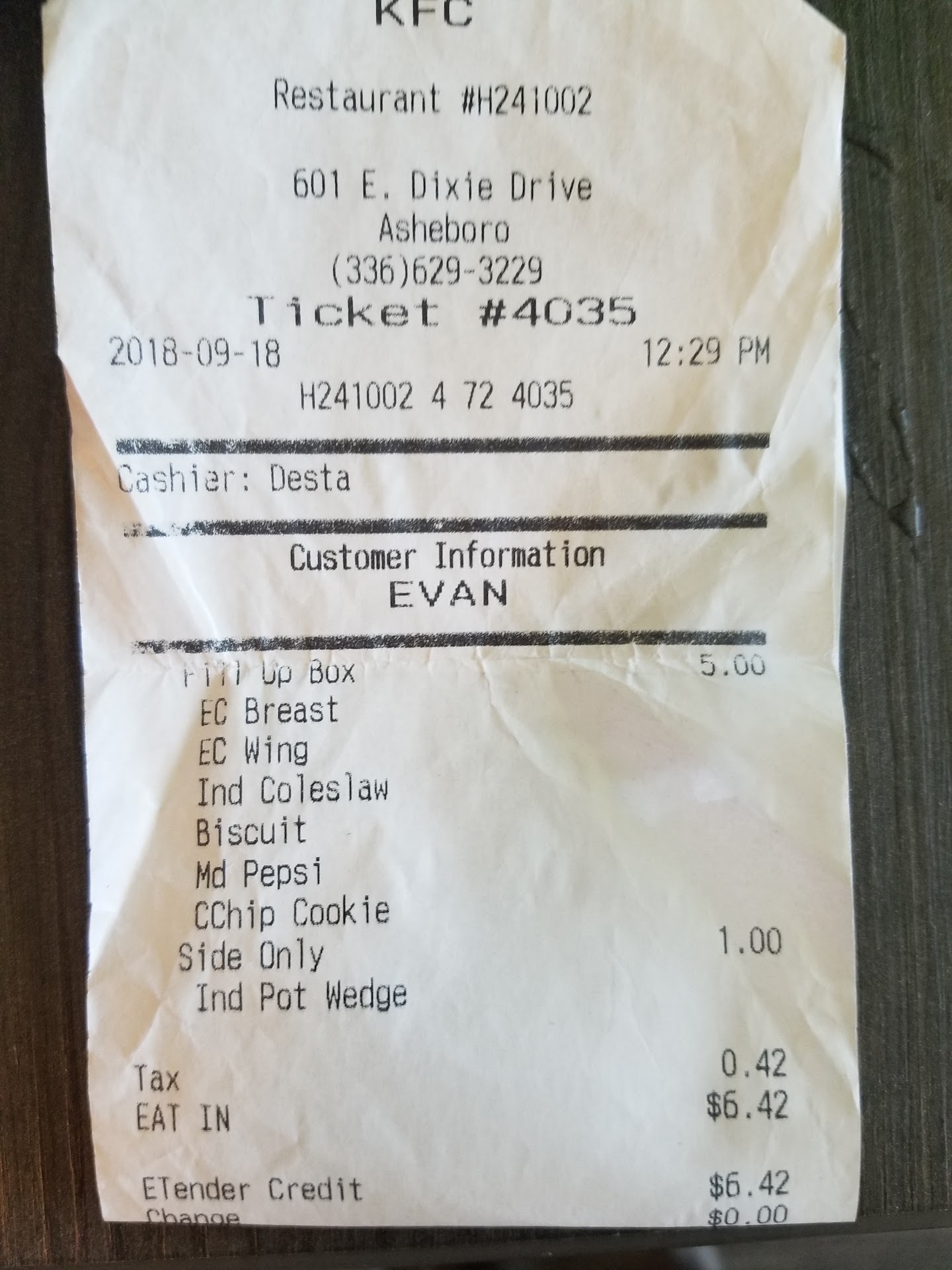 Read moreI PLACED A ONLINE ORDER AFTER DOING A LITTLE YARD WORK AND MY DAUGHTER SAID SHE HAD TAST FOR KFC. NOW NOTE I STOP GOING TO THE ASHEBORO LOCATION DUE TO BEING DISRESPECTED IN A PAST VISIT. BUT I SAID OK PLACED MY ORDER AND WHEN I GOT TO THE LOCATION I SEEN NO ONE WAS IN DRIVE THRU AND NO PARKING I PULLRD UP AMD WAS GREATED WITH DRIVE THRU CLOSED ( VERY NASTY TONE) I SAID OK BUT IM ACTUALLY PICKING UP AN ONLINE OREDER SHE THEN TOLD IN A NASTY LOUDER TONE YOU NEED TO COME IN. SO I DID AFTER REALY WANTING TO SAY FORGET THE ORDER. I GOT ON THE INSIDE ANS AFTER WAITING BOUT 15 MIN I SEEN A FEW LARGE BAGES SO I MOVED OVER TO THE PICKUP LINE TO ASK BOUT MY ORDER BUT WHEN I ASK THE GIRL ( AND I USE GIRL BECAUSE IT WAS CLEAR HER ACTIONS WAS AS IF SHE DIDN'T HAVE THE SENSE OF AN ADULT) SHE ASKED FOR MY NAME GAVE HER MY LAST ( NOW I RELIZED FROM THE TONE AND VOICE SHE IS THE GIRL IN DRIVE THROUGH) SO I GAVE MY FIRST SO SHE HANDED ME THE LARGE BAG AND SAID TO ME NEXT TIME GO TO THE COUNTER SHE WILL GET IT FOR YOU NO FOR ONE IF YOU DO HABE A PICK UP LINE WHY WOULD HABE ME WAIT BEING I BEEN IN THAT LINE FOR 15 MIN ALREADY AND NOW MY FOOD IS COLD... I SAW IT WAS CHILDREN AND ELDERLY IN THE BUILDING PLUS IT WAS SUNDAY SO I SAID I WAS GOING TO WALK OUT BEFOR I GO OFF. I NEVER BEEN SO DISRESPECT IN MY LIFE IN ANY RESTURANT TILL I CAME TO ASHEBORO. IM IN CUSTOMER SERVICE AS WELL AND A MANAGER AND IT IS NO WAY IN HELL I WOULD ALLOW NO TEAM MEMBER TO DISRESPECT THOSE WHO CONTRIBUTE TO OUR PAYCHECKS AND IT SPEACKS BOUT MANAGEMENT BECAUSE THIS IS AN ON GOING ISSUE.... I WILL NEVER STEP FOOT OR SPEND MY MONEY IN THIS LOCATION EVER AGAIN ONLY TO FIND OUT WHO THE GM...