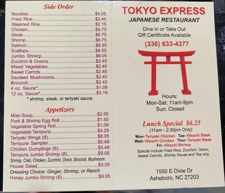 UPDATE!!! Price INCREASE as of June 1, 2022. Weekly lunch specials increased to $7.25 (with tax total is $7.76) Tokyo Express has REOPENED - 02AUG2021 and WOW things have IMPROVED! Dine In is available! Newly remodeled qnd back in action, well sort of, as this food is Takeout ONLY. Since the "C" word hit, they have either been closed or only open for takeout orders. Lunch service was quick and delicious. The "soupiness" was gone, and man were the portions HUGE! Great flavor. There were at least 6 employees inside the restaurant working/talking. Like other restaurants, I believe the profit margins are greater with takeout only service. It is not always about a lack of work force. So why open up fully and have the extra expenses like wear and tear, water/sewer, napkins, ice and beverage refills? Stop in and get your Asian grub on...ENJOY! 3 YEARS AGO..."This was the go to place for Asian themed food, but the quality started going down hill. Average food that tends to be a little "soupy." The inside needs a good cleaning and some...