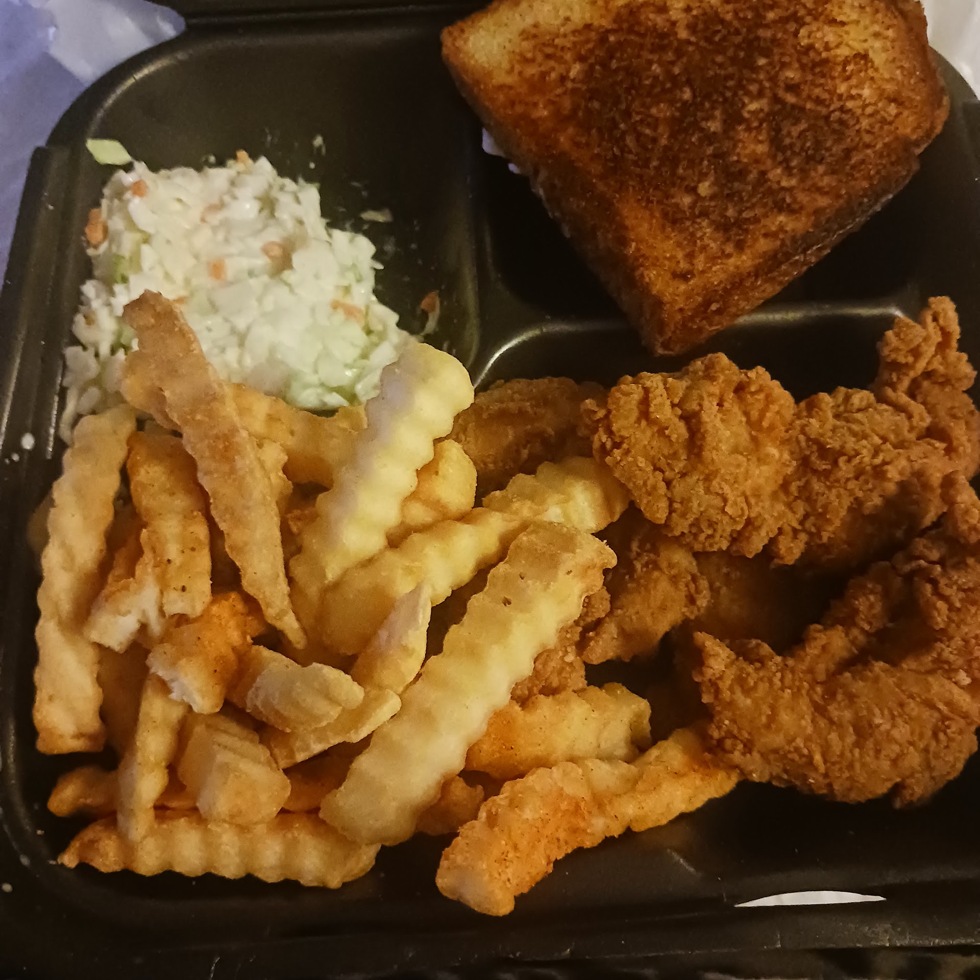 I ordered the 5 pc chicken finger plate with lemonade and 2 Eggrolls $15.47. The plate came with 5 chicken tenders,slaw,toast, and fries, 2 Zaxby sauces plus a lemonade. Let me tell you what, I absolutely loved about this that saved this review from being 1 🌟. The lemonade was 🔥, it tasted freshly squeezed or homemade, right amount ice, and I was happy. The Eggrolls were overcooked, but the filling was still good. If u like them over cooked, u will love them. Last of all, the sauces complimented. The egg roll had a chili sweet sauce, and the chicken fingers had Zaxby sauce. [Extra sauce is $.50 each] The worst part of this meal is everything was overcooked. This was beyond extra crunchy. The chicken fingers were barely chewable at times. And the toast was burnt and had a burnt taste. The fries were small, hard like a rock, and unseasoned. The fries are usually the best. They were horrible on my gums, I have missing teeth. Be cautious ordering this meal for elderly or people with missing teeth. Maybe u can ask them not to fry as hard. The taste wasn't there because of how hard it was fried and lack of zaxby seasoning. I gave a 3🌟 only because they didn't have a 2.5