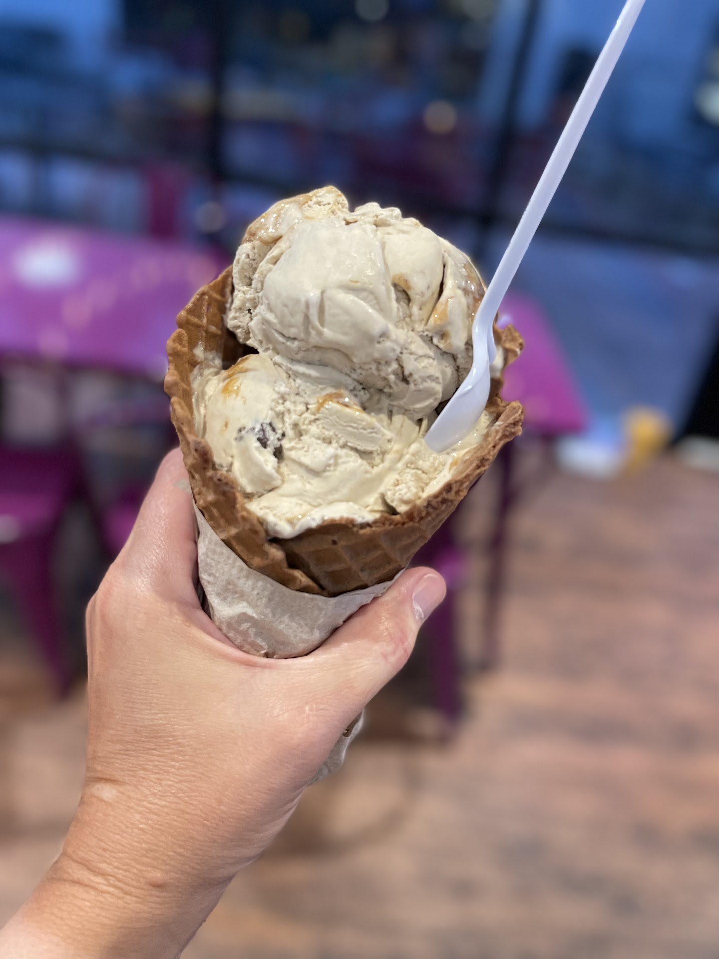 Ā Ā Ā Read moreWe made an impromptu stop in here on our way down the mountain for our weekly Sunday grocery shopping and I'm so happy we did! The cones here are made fresh. Now when they told me that, I thought they meant they make them fresh every day for the day, but I quickly realized what they meant was that they make it fresh per order! (Which also means the warmth of the cones melt the ice cream a little, so just know that for when you get to the bottom of your cone because it can get a bit messy- but still so good!) And bonus- they offer cinnamon, vanilla, and chocolate flavored cones a well! So Good!!! And the ice cream... Omgee!!! The ice cream! The pumpkin pie... The banana pudding... The apple pie... The coconut chocolate almond... AMAZING!!! The service was equally good! The 2 young ladies behind the counter were both so friendly and happy! You know it's a good day when you find both good service and ice cream!!! š We will definitely be stopping...