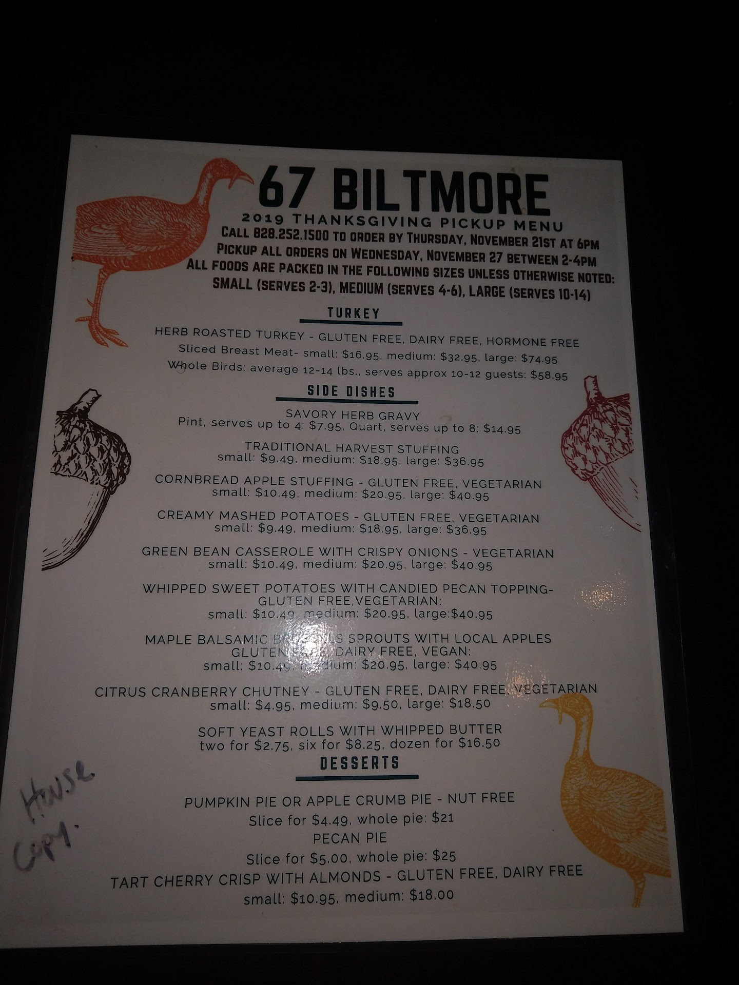 We were eloping in Asheville and needed a small portion that can accommodate our few guest that will attended. 67 Biltmore helped with this in a very short notice. Not only were they accommodating, they provided us with a good selection of food that we can pick from. After several email exchanges, they confirmed our orders and pick-up day/time. When we showed up to pick-up our orders, everything was ready along with heating instructions since we won't be serving them until later that day. During our pick-up we were greeted by the staff who were very attentive and were actually busy preparing other foods/meals. Their other individual takeout meals actually looked good. Back to our small catering order, we reheated everything 12 hours later after being in the fridge, and I will have to say - we were surprise how delicious the food were! We ordered chimichurri steak, pan-seared salmon, lamb balls with tzatziki sauce, grilled pulled-pork, and green beans and our guests enjoyed all of it. The portions were very good too that we were able enjoy it the next days.