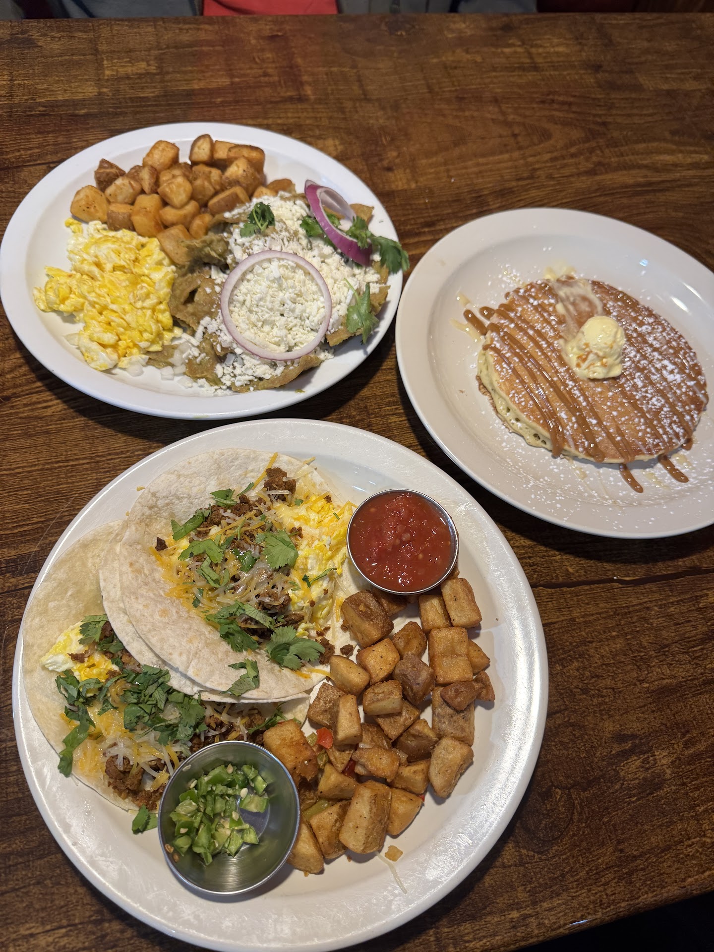 Once we were seated, our waiter promptly took our orders. The menu was more extensive than the other breakfast spot, which was a plus. Our orders arrived in a reasonable timeframe. So far, so good! But once our food arrived I had to start deducting stars. I ordered my breakfast burrito without bacon. It arrived with...you guessed it...bacon. So they had to remake it. My son's pancakes were supposed to be gluten free. They brought him regular pancakes, which could have been very harmful had I not caught it.