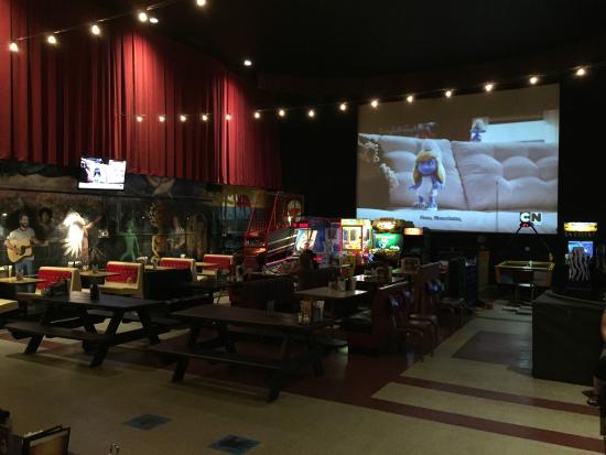 The screen is not that big and the sound is not that great but the experience of sitting in a comfortable chair watching some crazy movie while feasting on pizza and burgers and beer can't be beat.