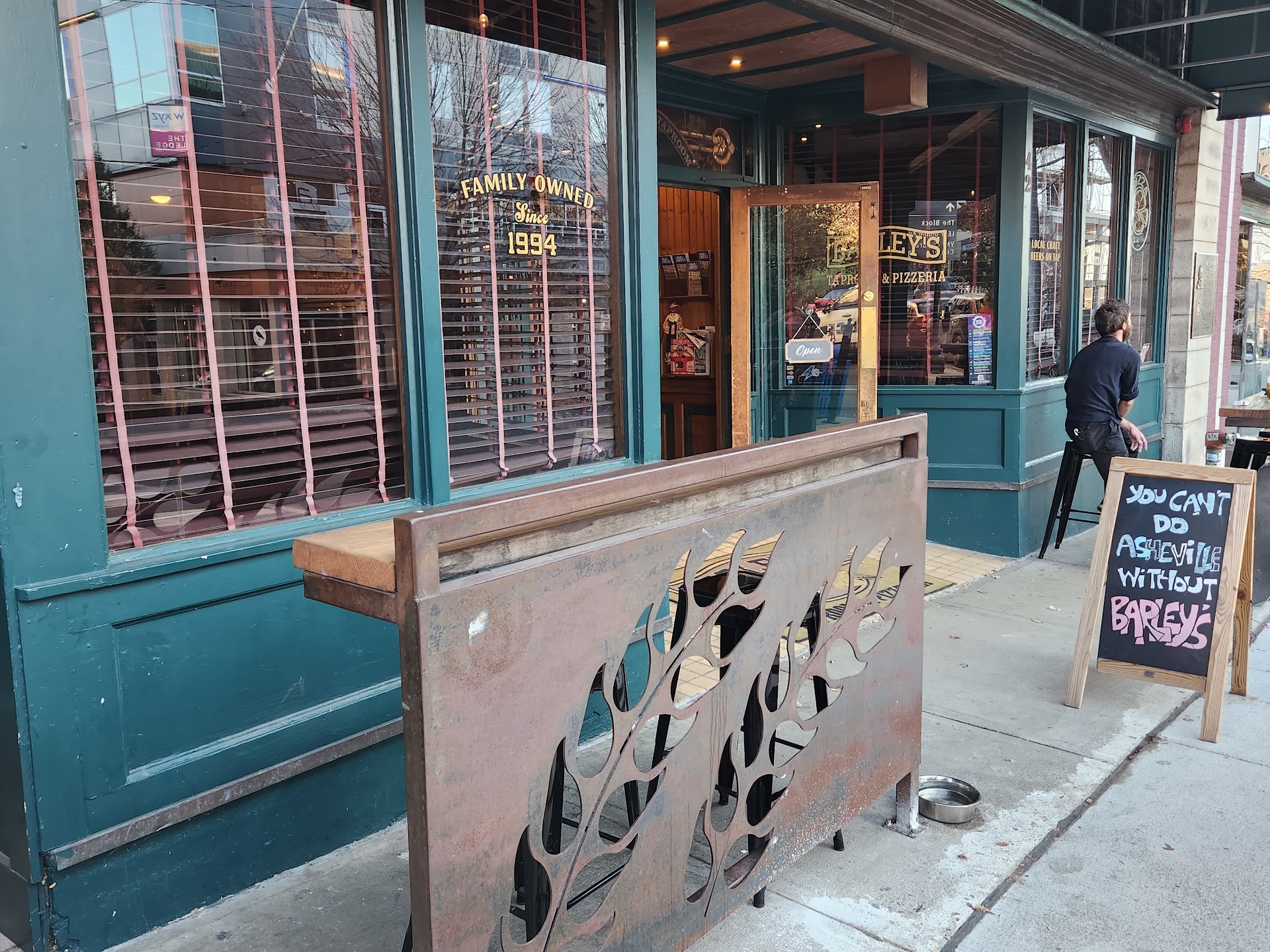 I meant to write this review awhile back,but forgot. So here we go. I was in Asheville with my GF for my Birthday weekend in February . We were walking the streets as the sun began to dip,and had plans to walk somewhere for Dinner. Suddenly we rounded a corner on Wall St,and we're nearly cut down by a cold blast of Arctic Wind. It was almost unearthly . It quickly changed our minds about continuing our walking adventure . We made it back to Aloft near death. We asked the Desk Attendant if there was ANYWHERE to get a pizza delivered from in this town. He cooly just said no. (Now I know he was lying,but that's another review). Anyway,he did flppantly direct us to Barleys Taproom across the street. Into the wind,again we go. Enter Barleys.Instantly relaxed. That kind of vibe. Hard Wood and Brick.I like it.The place was jumping,but families with children were perfectly happy sitting at the tables munching on pizza and other treats. A live band was cranking out tunes in the corner. We bellied up to the bar. Now,I'm not a Craft Beer guy,but your not gonna get a Bud light here. The Bartender was more than helpful finding me a decent brew I could handle. By this time I'm starving. We ordered a large Barley Special (supreme). Despite the packed house the pizza arrived without mutch delay. It was nice looking,generously topped,and the crust was right. More beers,happy munching ensues . After being about to pop,we paid our tab,and the Bartender hears me say "I wish there was a good close place to shoot some pool ". He promptly tells me I'm in the right place,and sends us upstairs. Behold! Another bar. No kids here. This is where you can get a little loose in the right way. Another cool Bartender. Nice large Pool Tables. Things get a little fuzzy after that,lol. We drank,and laughed,talked about Barleys Ghost(it's allegedly haunted), and chatted with some younger local Hipsters. We didn't mind that they were,and they didn't mind that we werent. Everyone's accepted. In short,we shut em down. Stayed till close. I left with a warm glow,and a full belly. My only complaint is that I had such a glow,I left my left over pizza behind :( . Man!! That sure would a been good for breakfast. Thank you Barleys,...