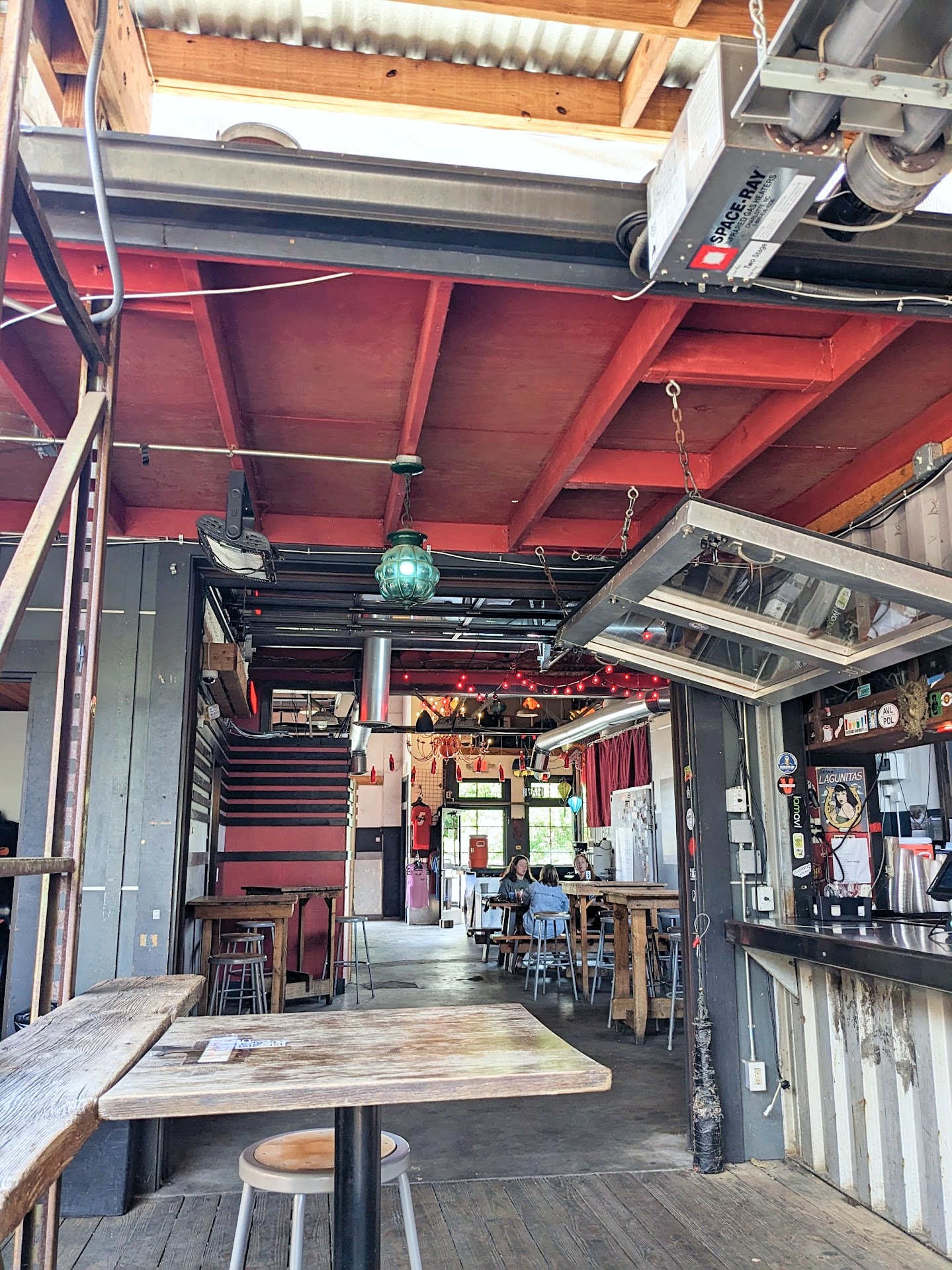 The good: the space itself is awesome. Indoor, outdoor, in-between, open fires outside, warm and cozy inside... summer or winter, rain or shine, this place's space has an amazing mix so you can cool off, dry off, or warm up as needed. Despite it being small, it seems to fit a ton of people. The bathrooms are generally quite clean, and if we're bar hopping I sometimes purposefully wait until we get here because I know they're fairly nice about trying to keep the ladies room clean. (I cannot speak for the men's room.) Also, this place is very Hasher friendly!