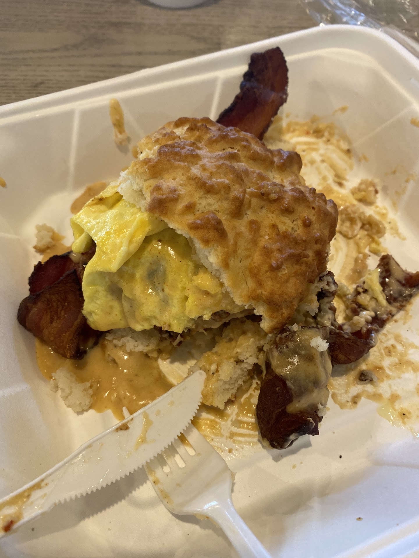 My replacement was a fried chicken biscuit "sandwich" that came, surprisingly, with a bone-in, fried chicken thigh. A big, fat chicken bone in the middle of a "sandwich". It was all tasty, but just another head scratcher for me. The biscuits are always doughy and under-salted.