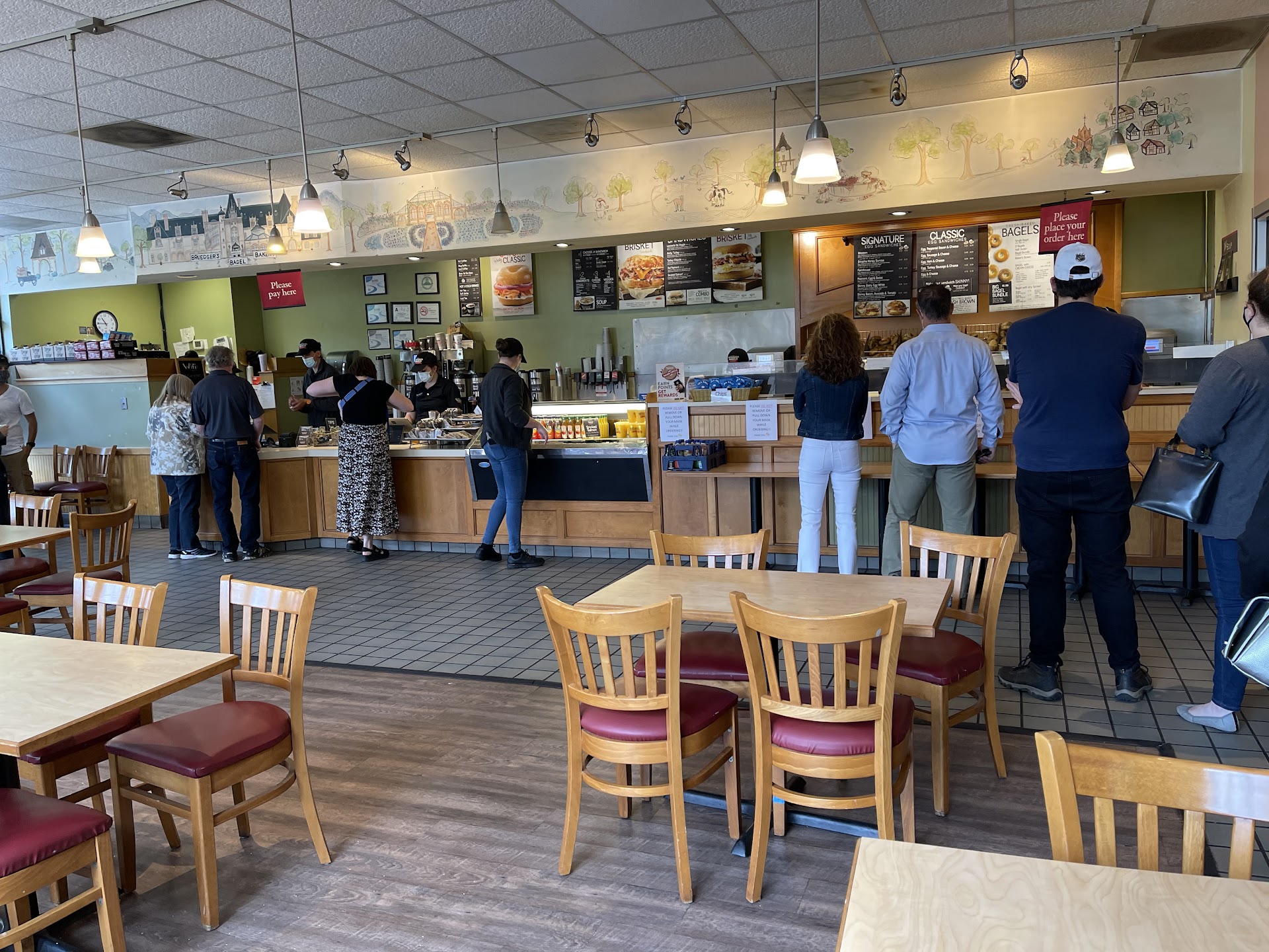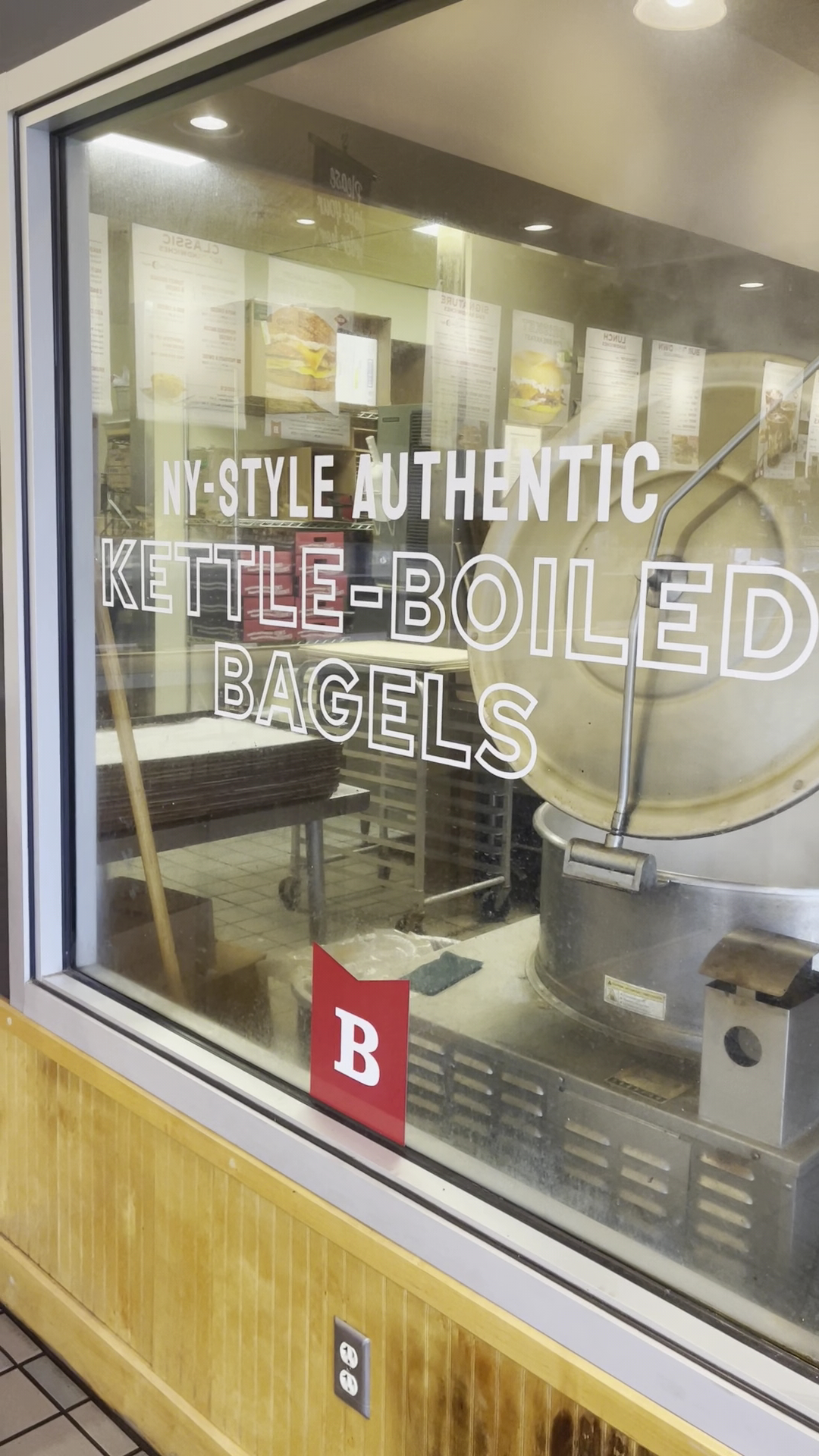 We've been going to this Breugger's for a couple of years now. We LOVE the food. It is always delicious. However, the service and atmosphere leave much to be desired. The bathrooms are always disgusting. I have been to truck stop bathrooms in Iowa that are cleaner. The employees making the orders are mostly delightful. The employees running the register and/or managing are not. They talk to each other the whole time, play on their phone or ignore customers until THEY are ready. They talk very loudly about their personal business. They will laugh and smile at each other which is great, but then look at customers like we are an inconvenience of their free time. Even when not busy, they will be chatting and not cleaning the extremely dirty dining area. We understand everything bagels can be a bit messy. However, every table is always dirty. We are cleaning up after the customers before us every week, so we can sit and eat a meal with our daughter. I've hoped for a long time someone would say something or do something to clean this location up. It hasn't happened. So, after all this time, here is my review. Also where the bagels are boiled needs to be properly sealed, bleached and repaired. There's so much visible mildew, it's icky and the metal along the window is broken. Come on, friends. We can do a bit better for an eating establishment. I think we will check out the other location next week and see if it's a better fit for us. It's a little more out of the way but if we're coming 30 minutes out of town for breakfast every weekend, we want to go where we are comfortable and don't feel like we have to clean up...