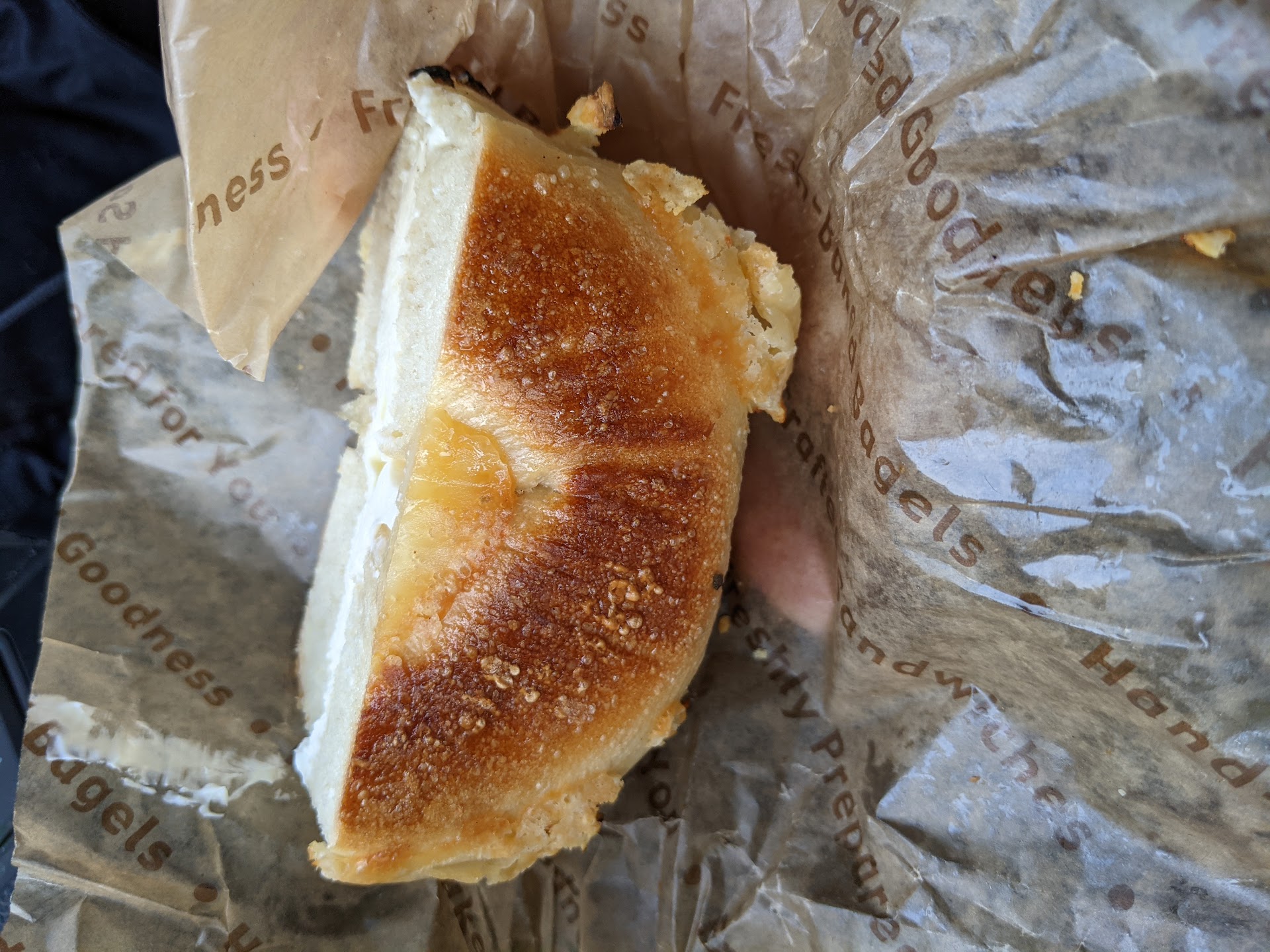 The cream cheese was wrong. For me, Philadelphia is the baseline for cream cheese, this stuff was likely a cream cheese "spread". It liquified inside the toasted bagel, above and beyond normal melting, and got everywhere.