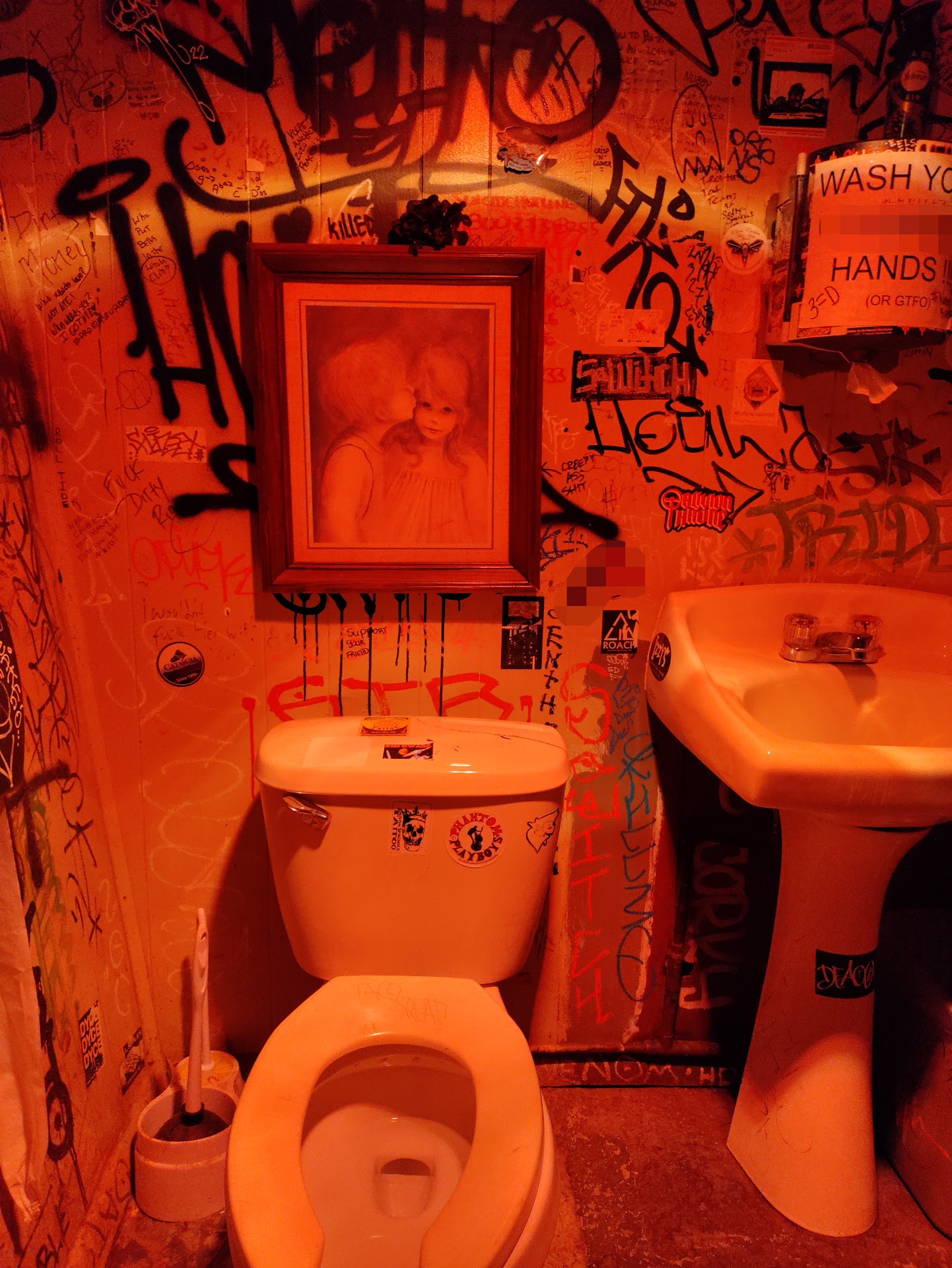Burger Bar is home to my favorite art installation of the season. Gritty and sweet, but never saccharine, this piece (I think itâs called âPublic Restroomâ??) explores themes as diverse and wide-ranging as economic insecurity and stratification of wealth, original sin, identity, and some chick named Linda. For me, itâs a Canât Miss!