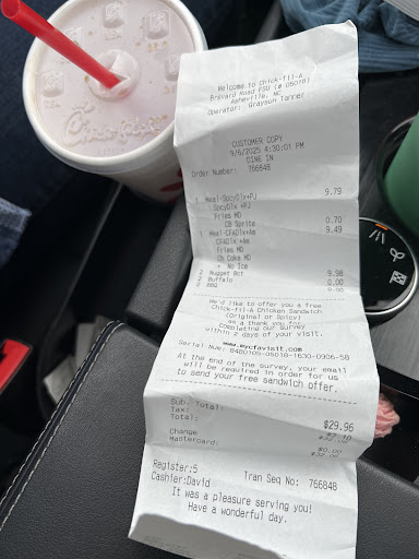 Read moreI just had the worst experience at the Chil-Fil-A on Brevard Road. I ordered and received my food with no problem. As I was leaving, I stopped at the end of the counter and removed the lid to my tea so I could get a refill. The two young girls (one pale blonde and one darker skinned brunette) turned to look me directly in the eye and then turned to continue their conversation.