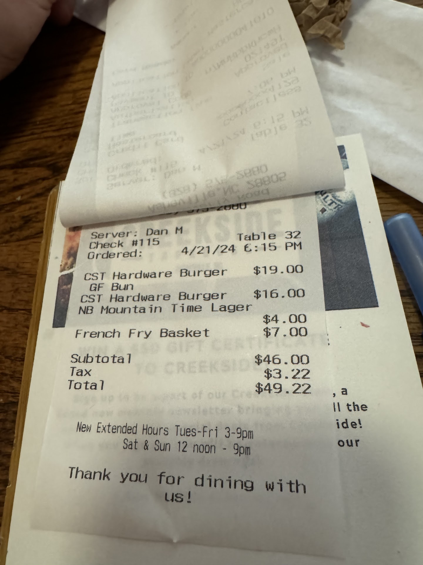 My family and I went today (4/28/17) to Creekside and I have to say it's the worst experience I've had in a restaurant, by far. My spouse and I have worked in the industry for over 8 years as a cook and a server and we're pretty understanding. The wait was quoted at 40-45 minutes even though there were obviously entire SECTIONS open inside and we waited for 50, which, honestly is not that bad. Well, we got seated, the side of the picnic table where we put our 1 year old son in his high chair was torn up so there was shredded wood right in his reach and no room to move the table to get to the other side. We waited about 10 minutes for the server to come over and get our order. Our drinks took about the same amount of time. Then, for a kids chicken tenders, veggie sandwich and a patty melt (which wasn't what he ordered), we waited 40 minutes. until the baby couldn't handle the hour and a half we already spent there, so we asked the server to box our food. She instead brought us boxes even though the food obviously could be made and set in the boxes in the kitchen. She gave us our check so I could pay it and then we waited another 20 minutes before we had to go inside only our food was obviously dying in the window just sitting there while our server was outside, right next to where I was sitting waiting for the food, talking to two other customers for the whole 20 minutes I waited! 1 whole hour for food that, at home, would have taken a third of the time! The food, when we got home to eat it, was lukewarm (we live 2 minutes away) and disgusting! Chicken was burnt, caramelized onions were old and overcooked and my spouse didn't even get the sandwich he wanted! We've gone during the week and had gotten good service and quick delicious food. This was a dysfunctional restaurant on one of their...